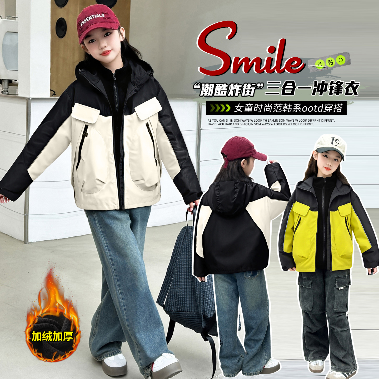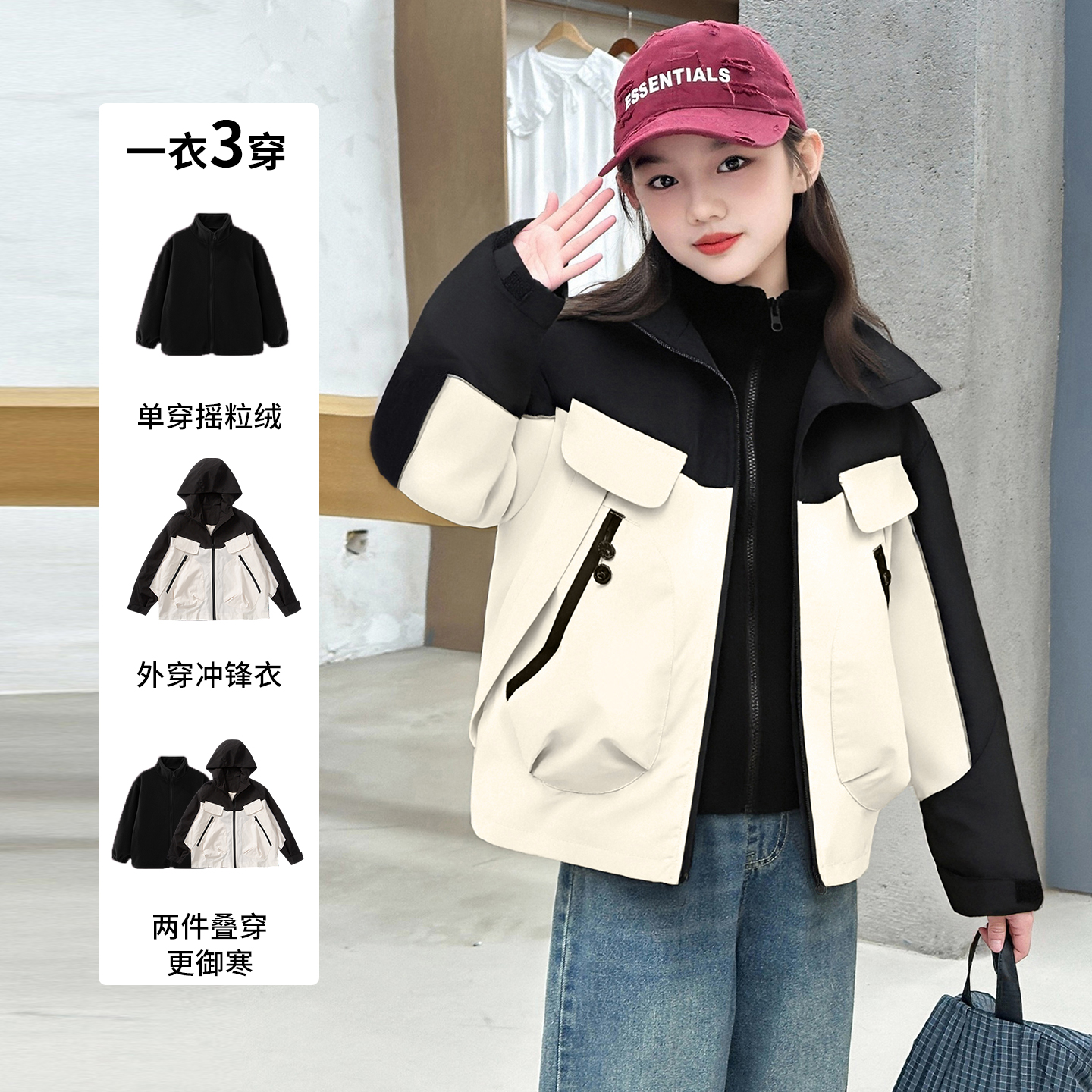 女童冲锋衣可拆卸秋冬2025新款 洋气中大童高端三合一连帽加棉外套