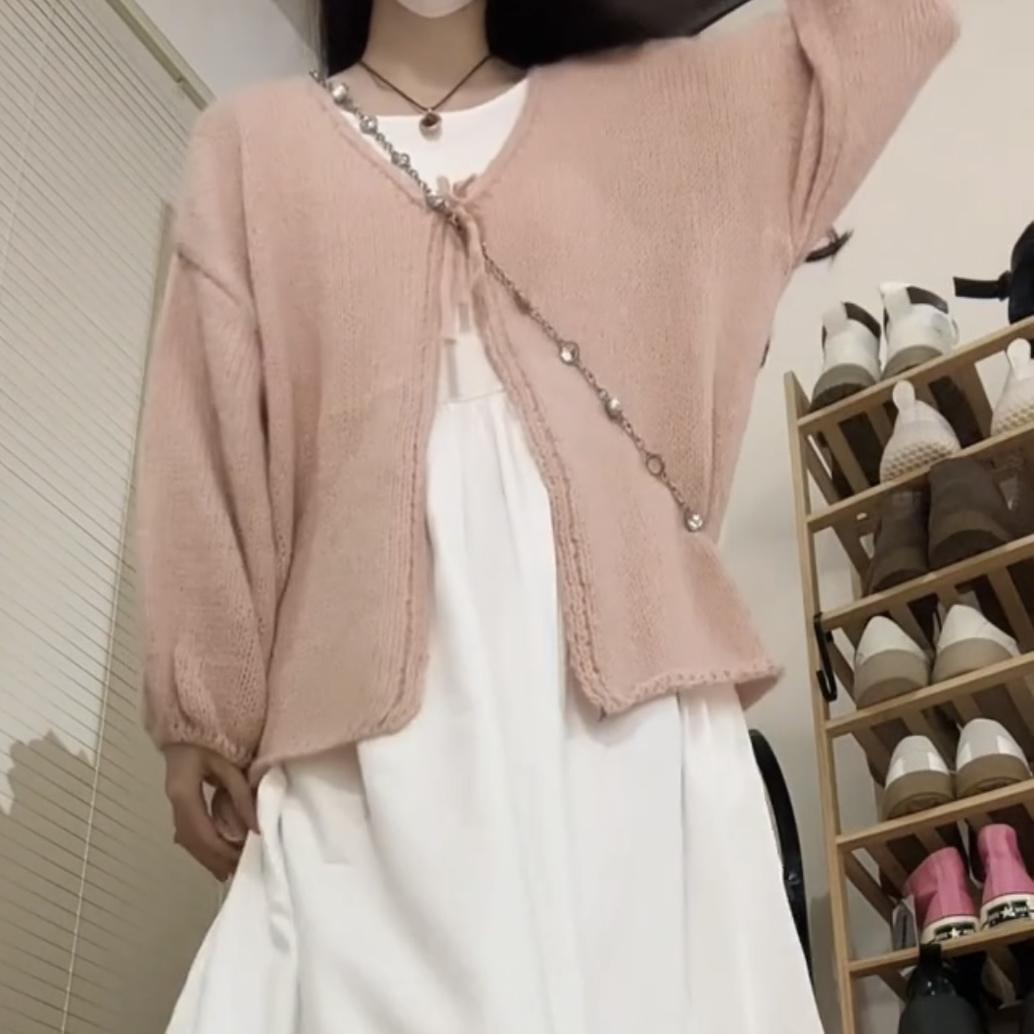 上衣 外搭针织开衫 今年流行漂亮粉色灯笼袖 毛衣外套女2024秋冬新款