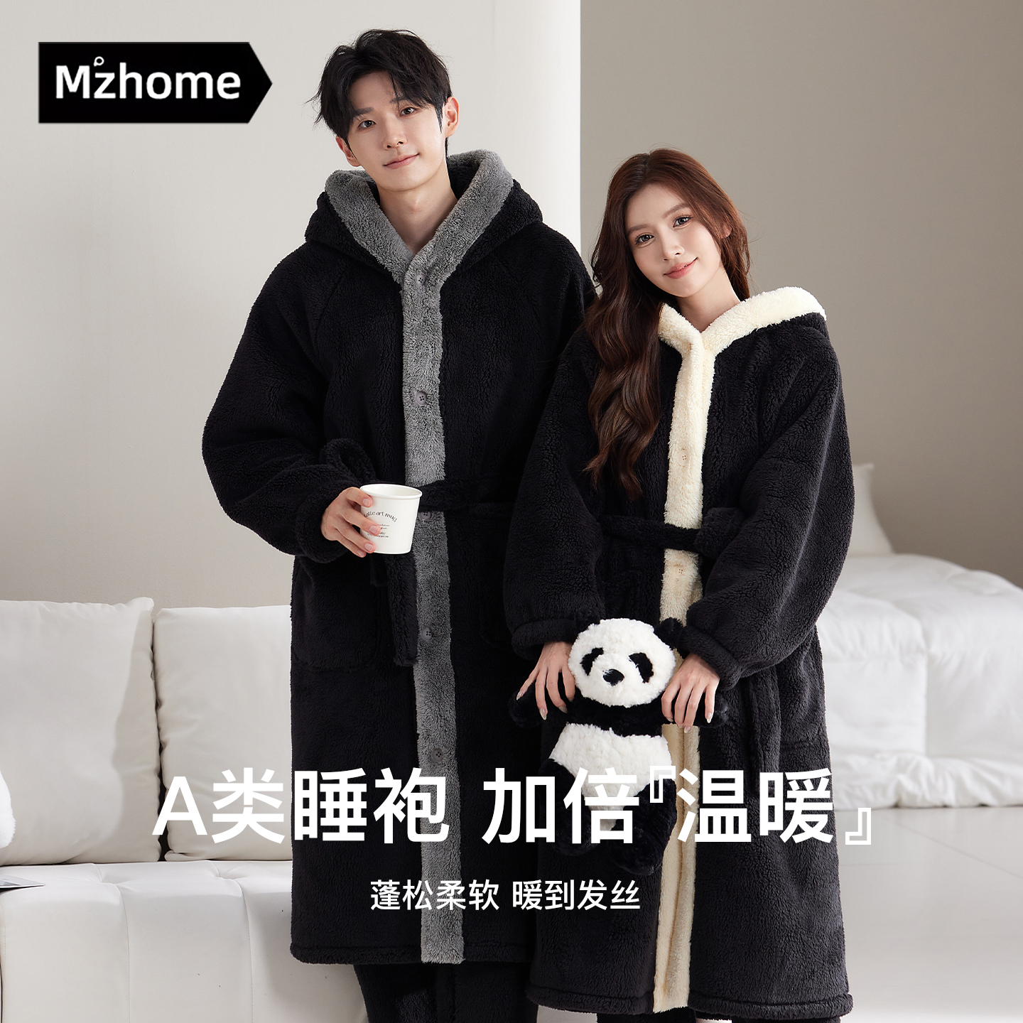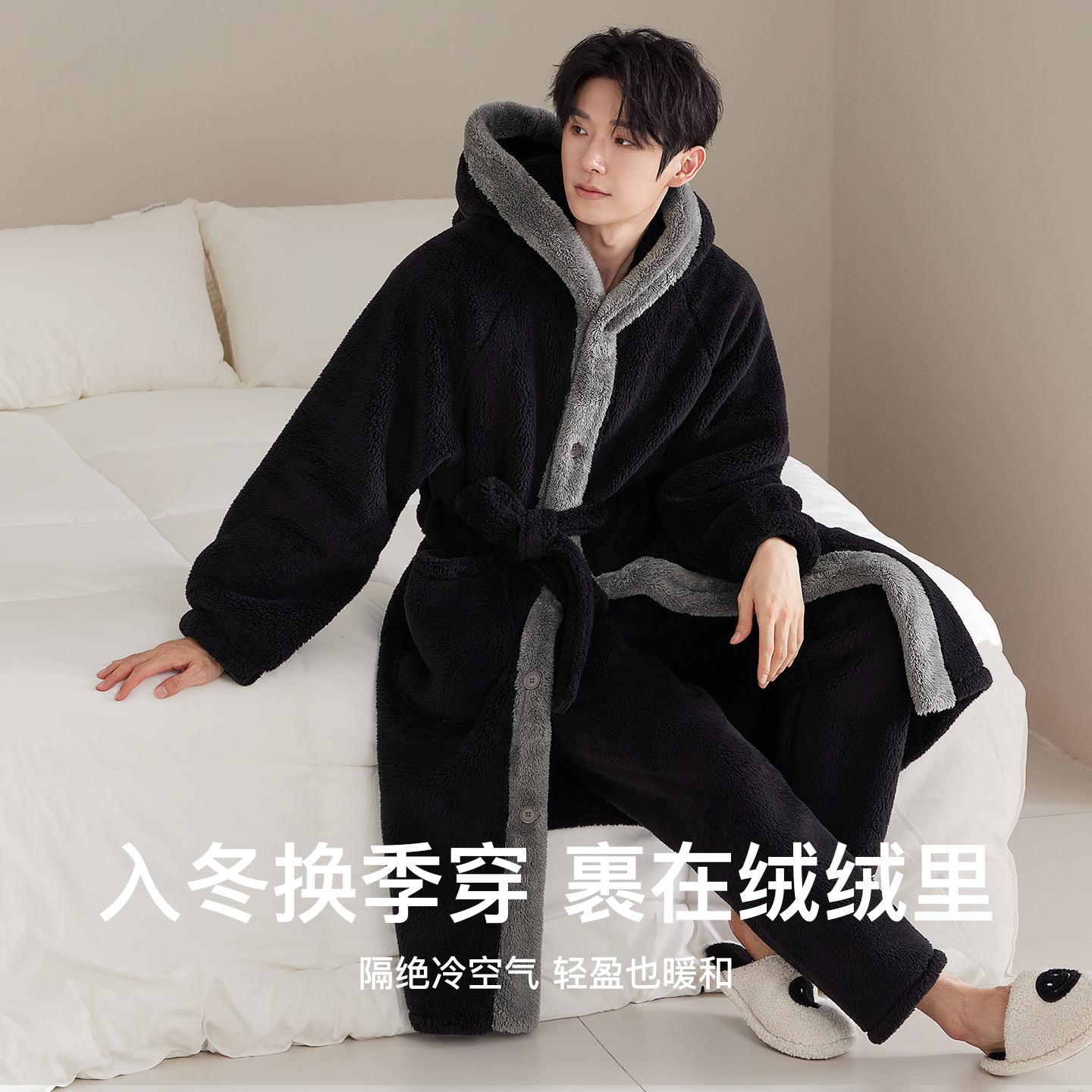 法兰绒家居服 保暖睡衣男士 秋冬季 珊瑚绒情侣睡袍女加厚连帽加长款