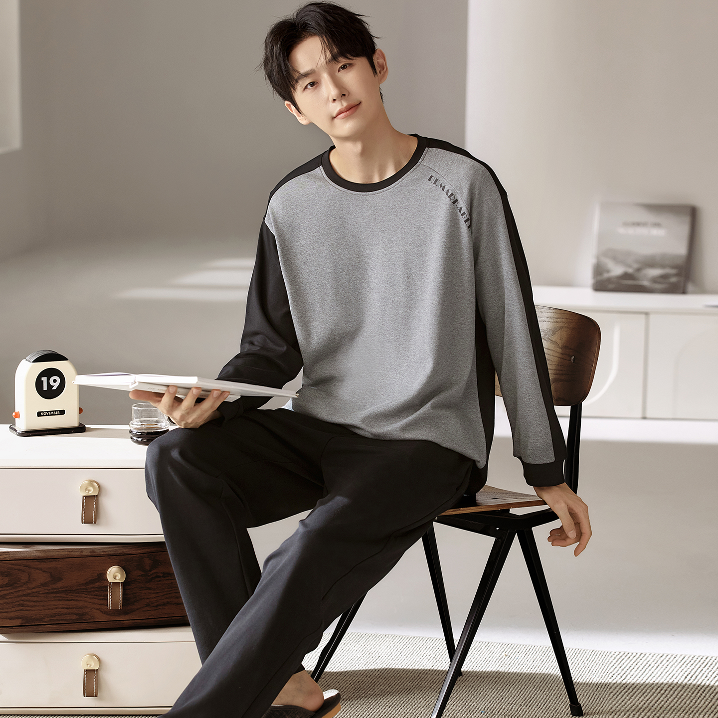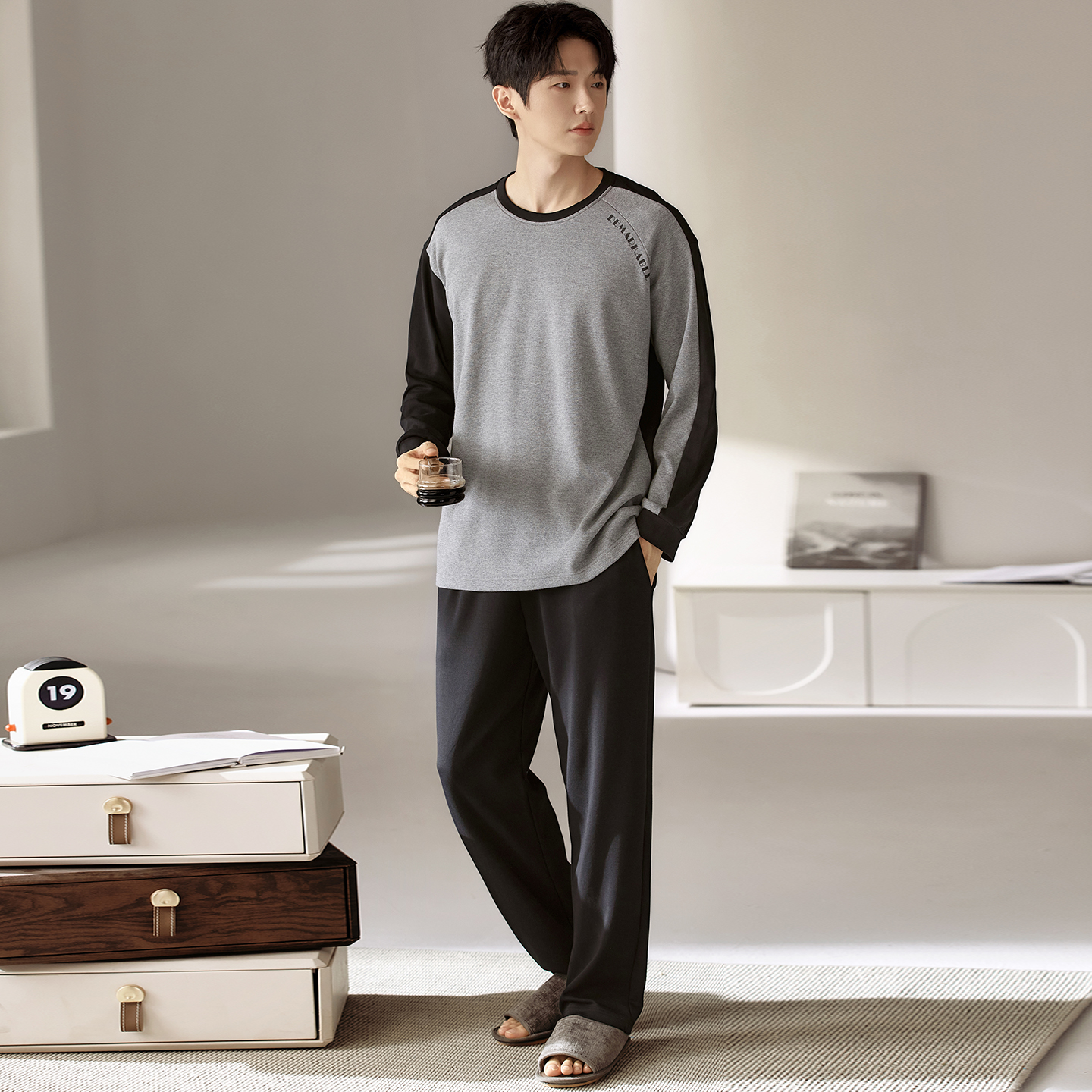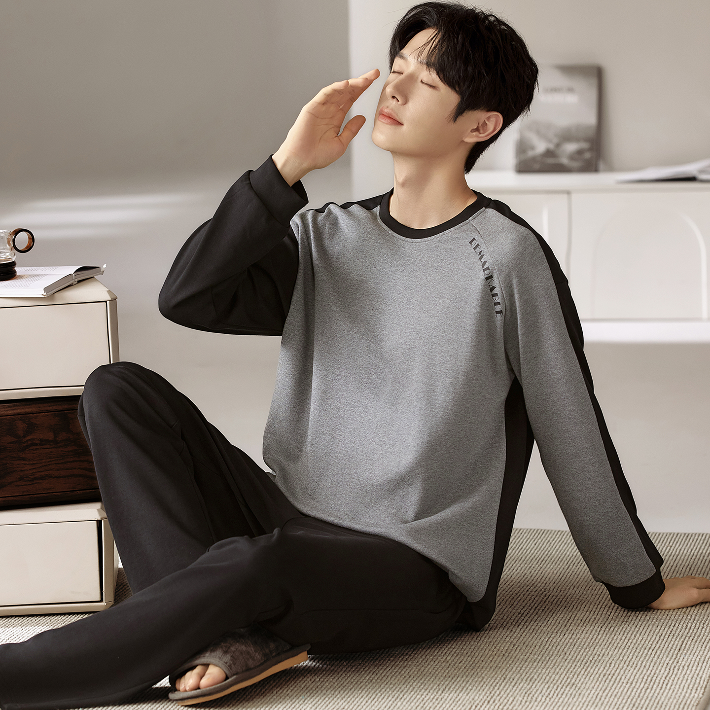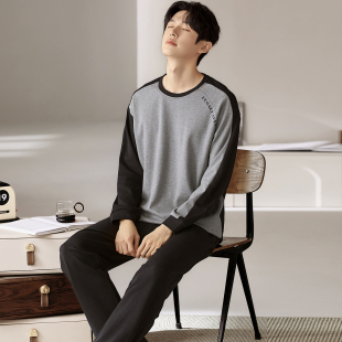 休闲宽松家居服套装 宜而爽纯棉圆领睡衣男士 长裤 长袖 可外穿 春秋款