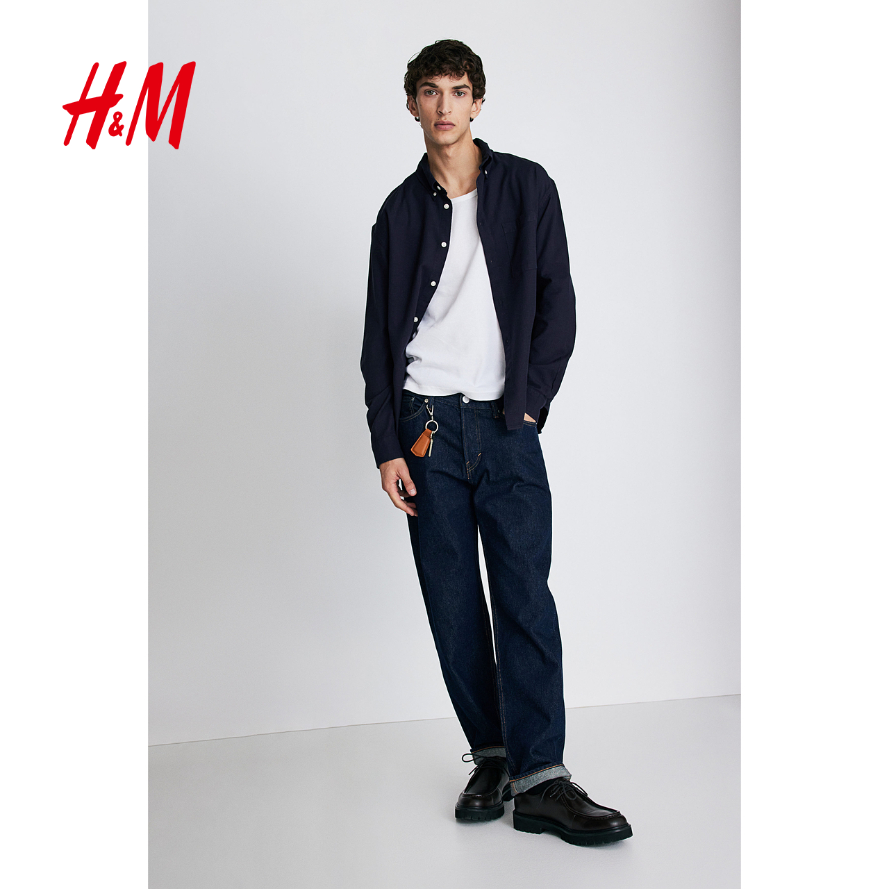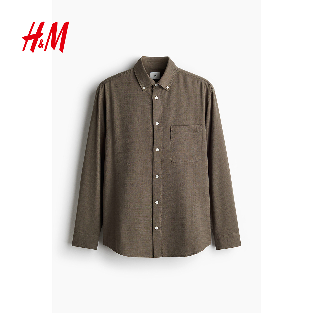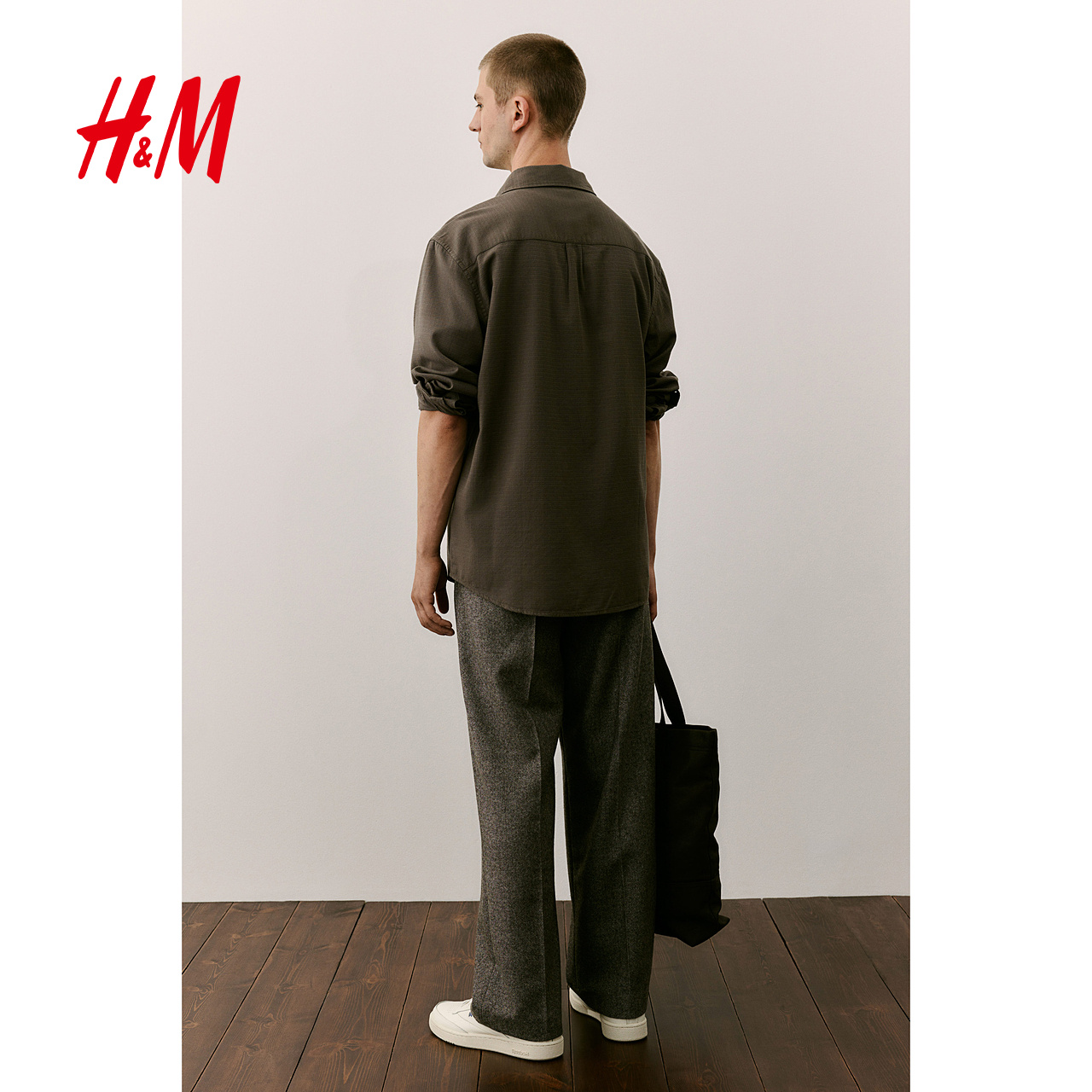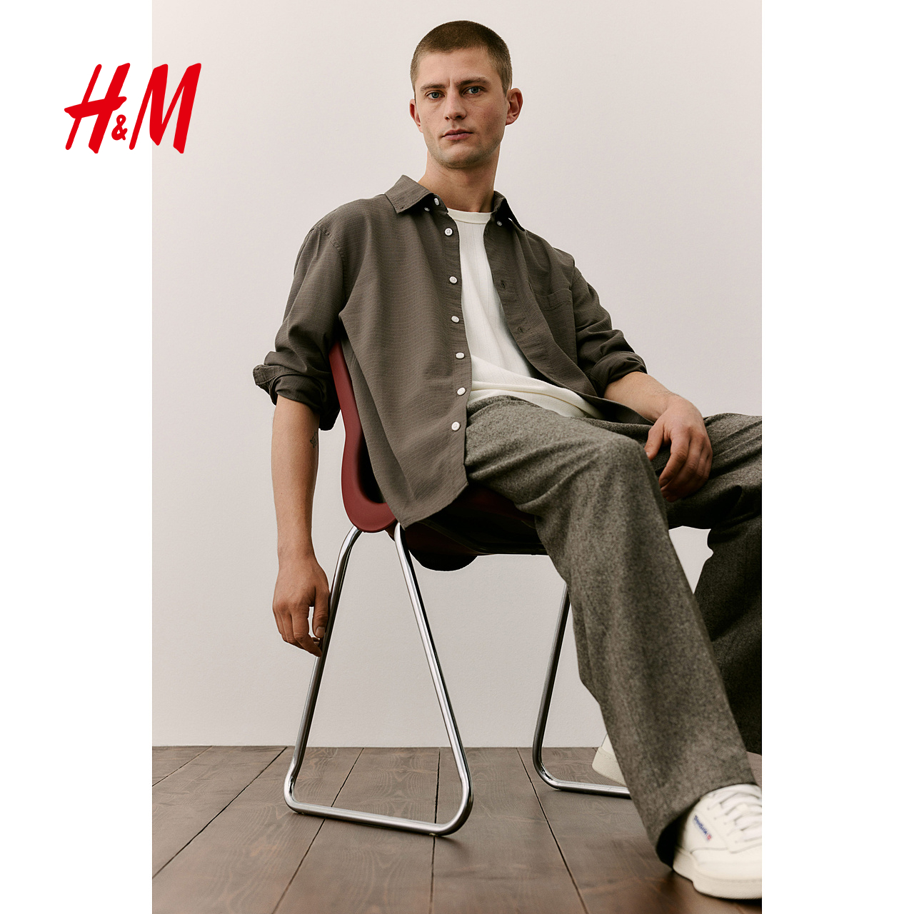 翻领纹理感长袖 HM男装 新款 秋季 衬衣休闲薄外套上衣1251263 衬衫