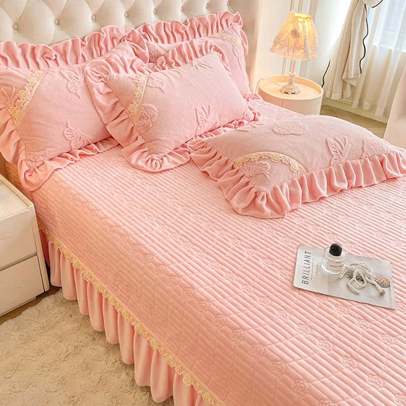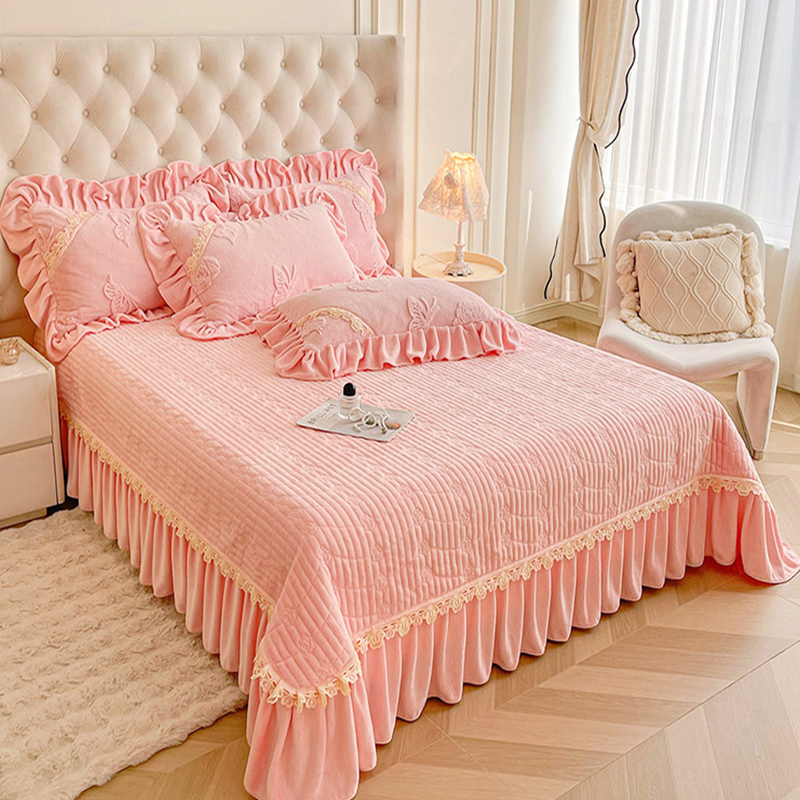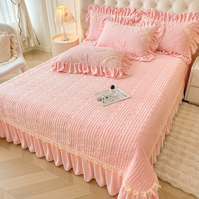 ins公主风兔毛绒床盖单件带花边珊瑚牛奶绒床单加厚床裙式 三件套
