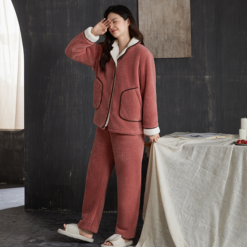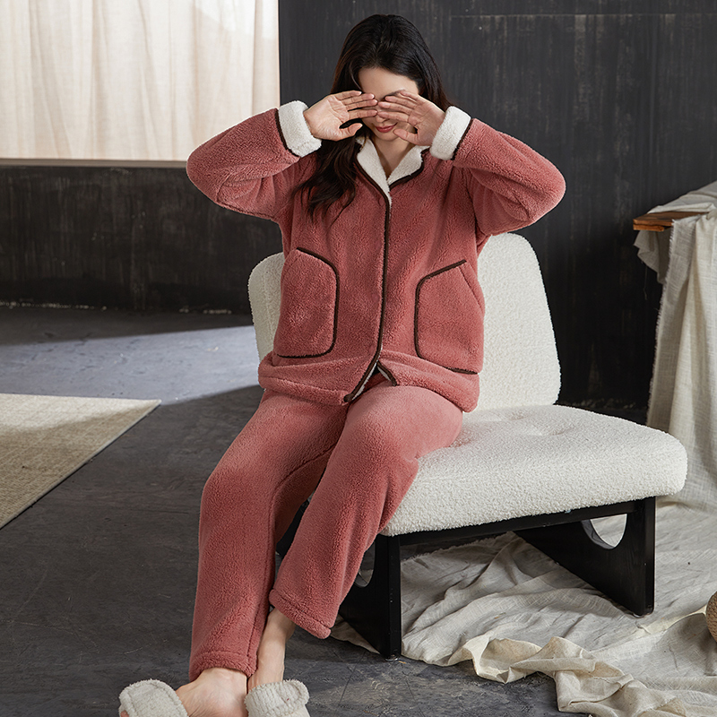 秋冬翻领粉色毛领撞色豆沙女冬季 女士保暖可外穿家居服加绒睡衣