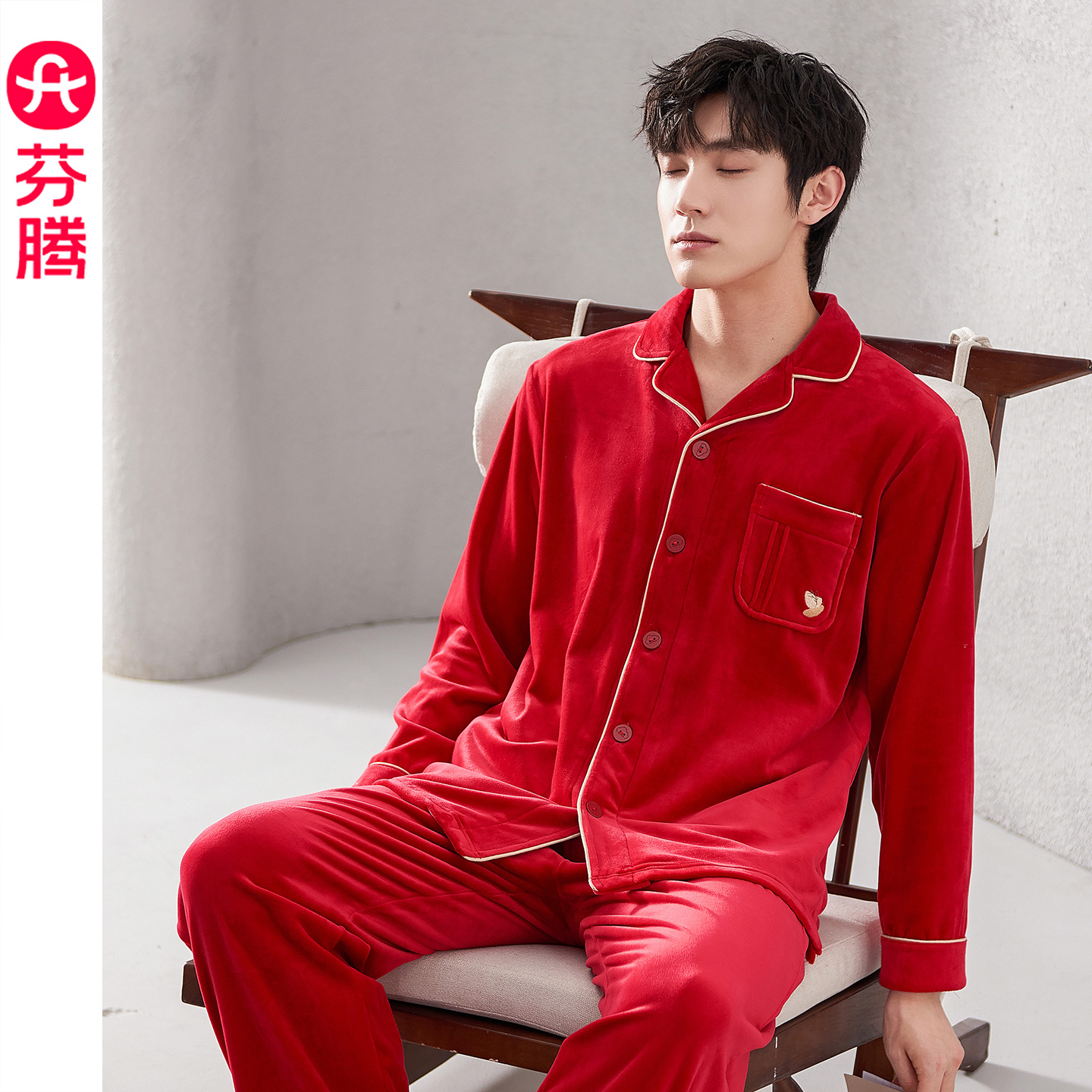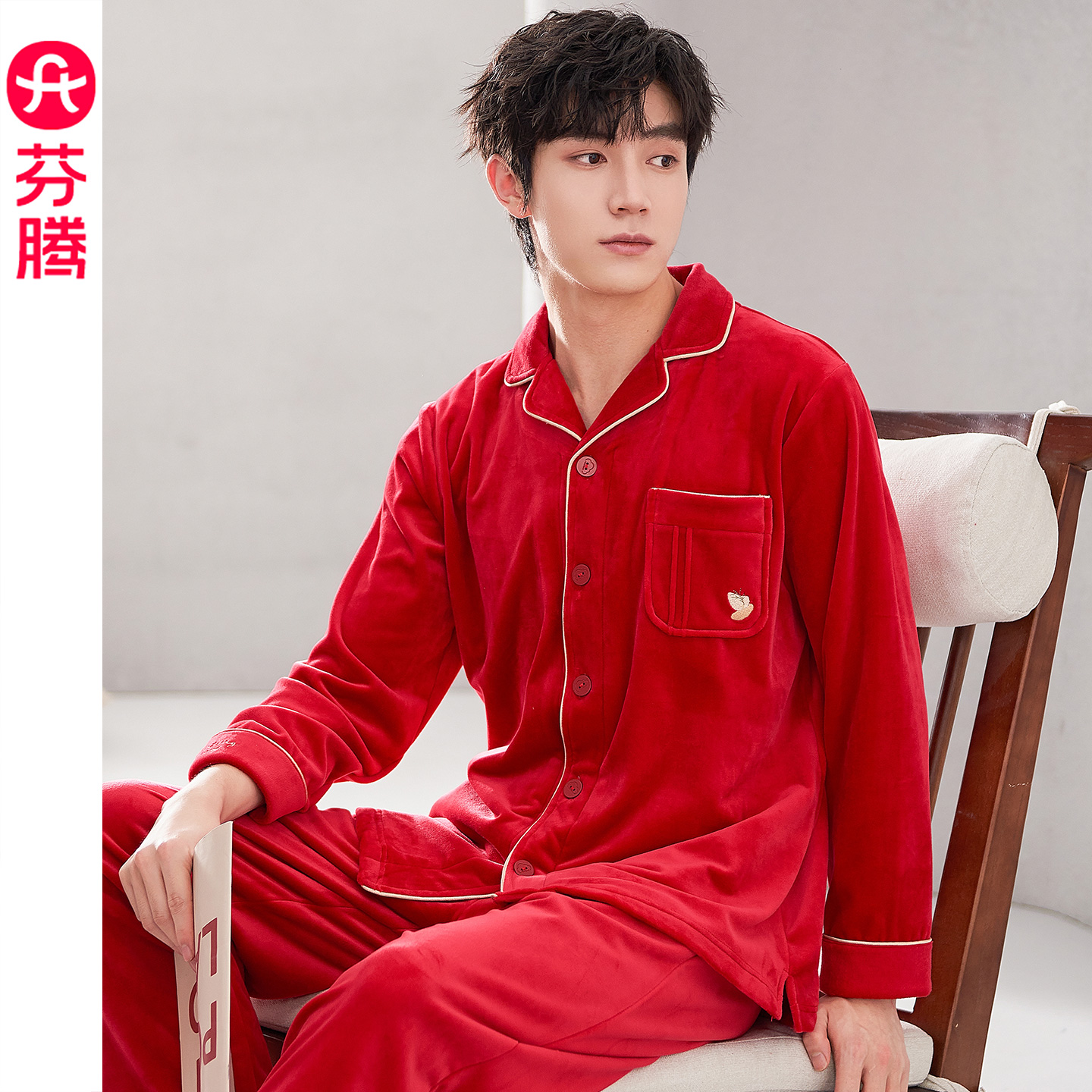 芬腾大红海岛绒睡衣男秋冬加绒加厚结婚外穿家居服珊瑚绒套装 2025