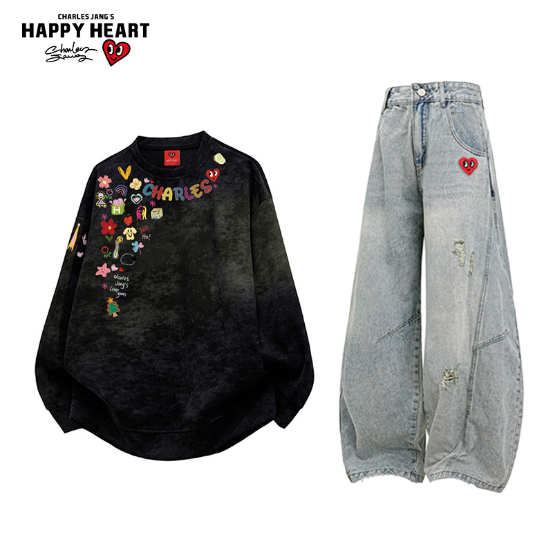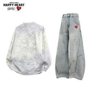 一整套 潮高街圆领卫衣牛仔裤 查尔斯桃心休闲套装 男女春秋2025新款