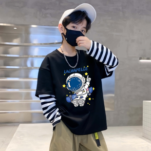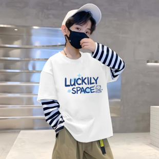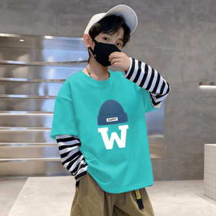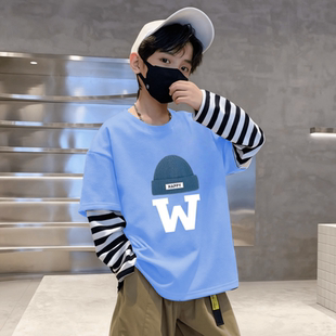 T恤儿童条纹拼接假两件宝宝百搭打底衫 长袖 上衣 新款 2025男童秋装