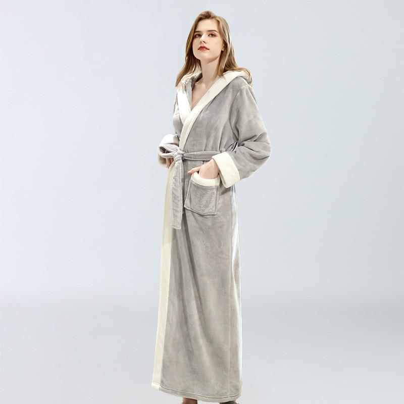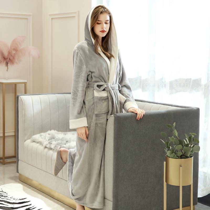 珊瑚绒睡衣长1009c 法兰绒连帽粉色加大码 秋冬浴袍女秋冬款 加长款