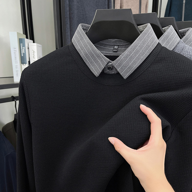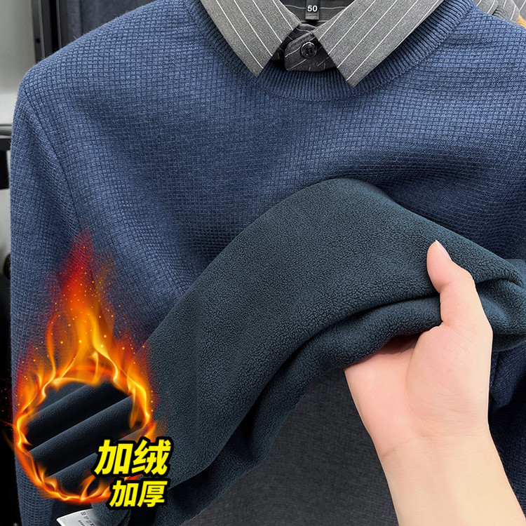 新款 25秋季 提花假两件厚毛衣男 海澜之家轻商务加绒双领针织衫 HLA
