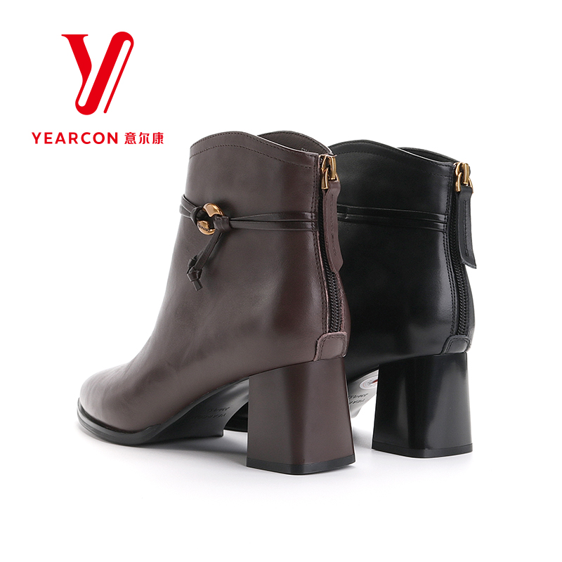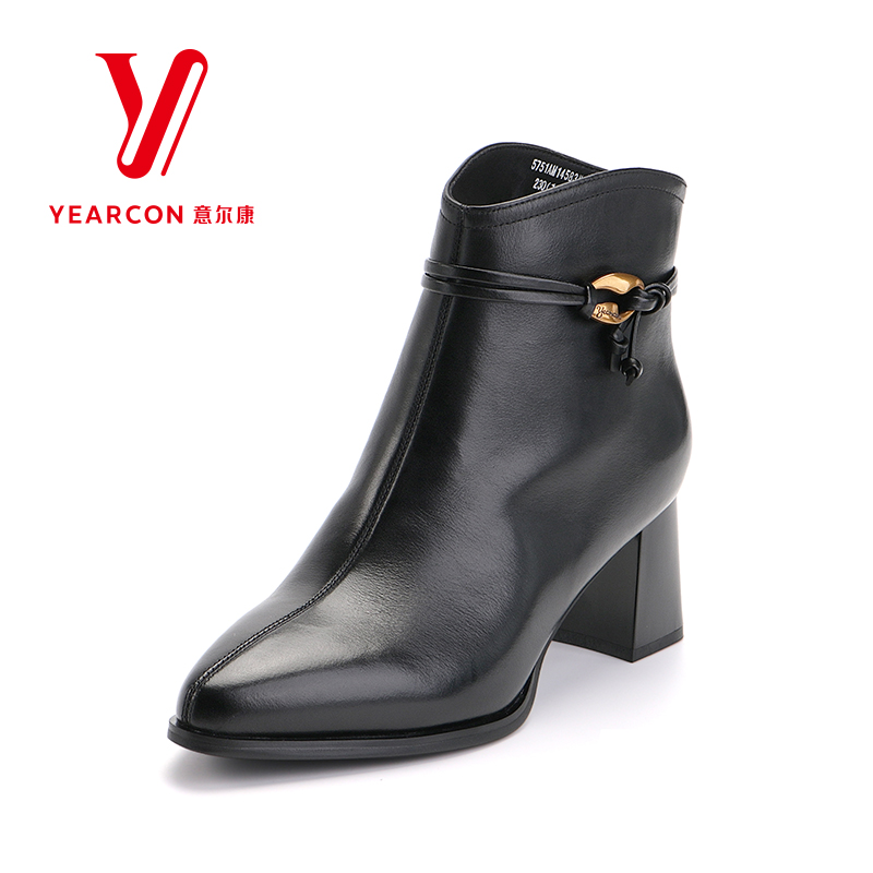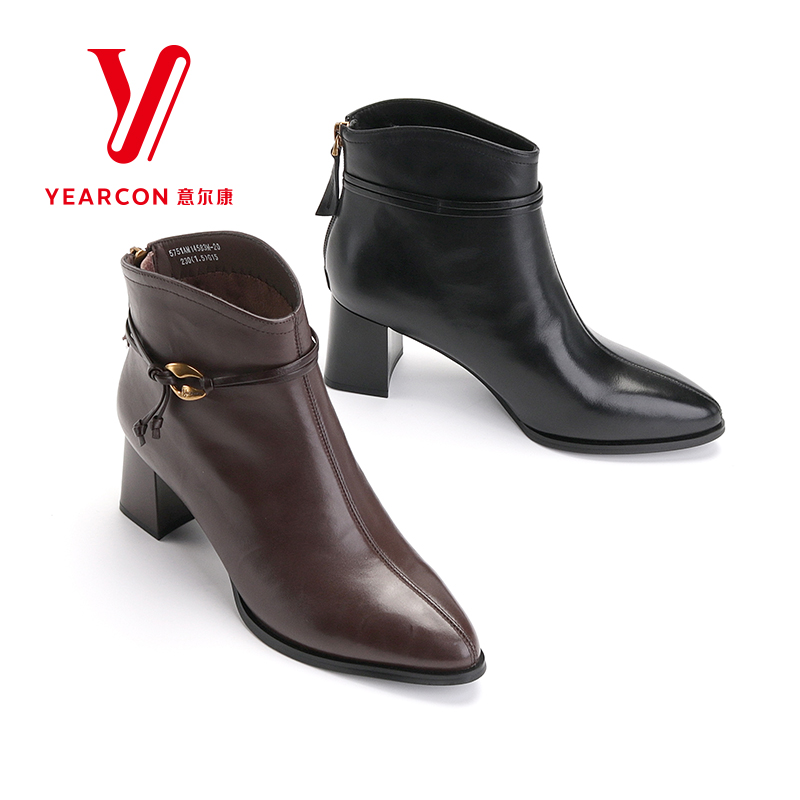 意尔康女靴2025新款 尖头真皮短靴女加绒粗跟靴子高跟短筒靴 秋冬季