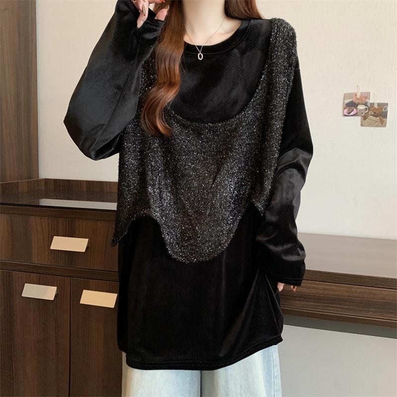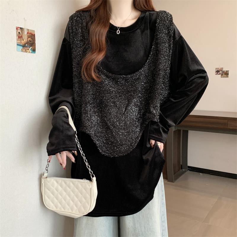 胖mm中长款 秋冬黑色金丝绒打底衫 大码 2025新款 假两件上1010z 女装