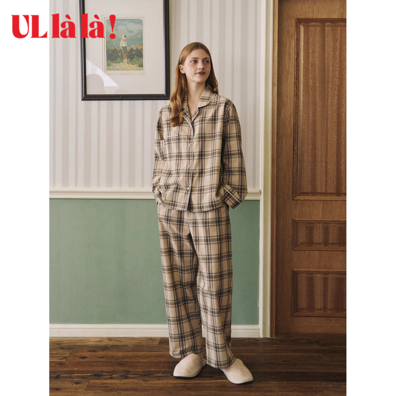 家居服简约翻领方格套装 长裤 长袖 Ullala韩国乌拉拉进口睡衣女秋款