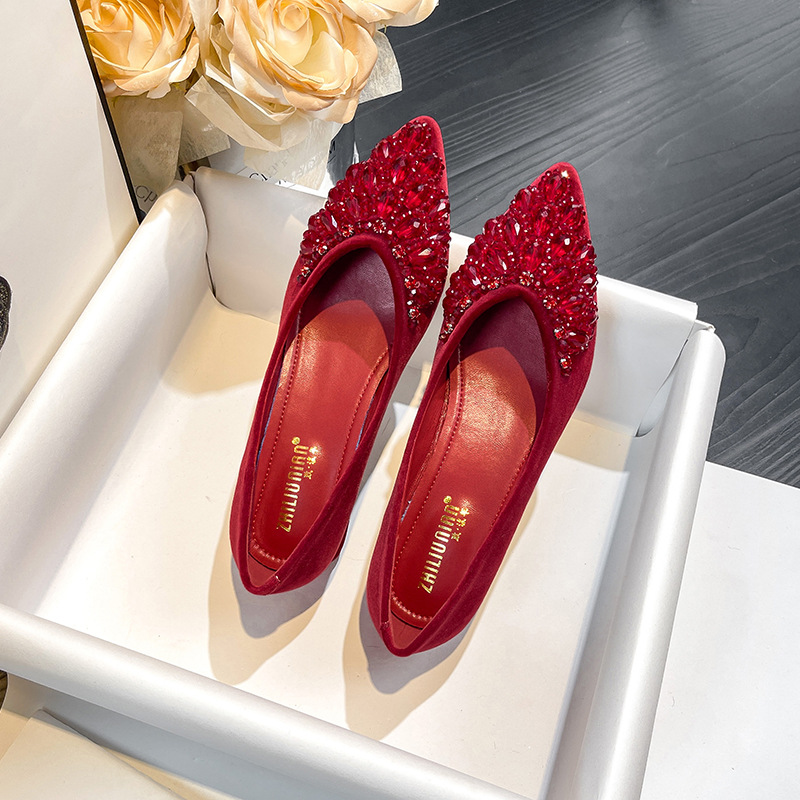 浅口粗跟不累脚一脚蹬单鞋 尖头红色水晶丝绒中式 风敬酒服秀禾婚鞋