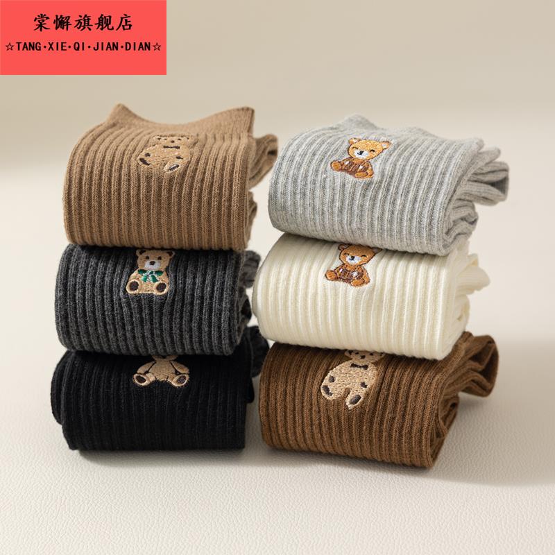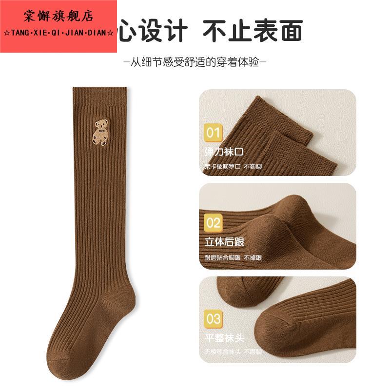 儿童长筒袜韩国女童刺绣小熊过膝袜学院风纯色高筒袜宝宝护腿棉袜