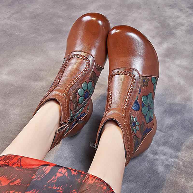 女粗跟软底防滑短靴 牛皮靴子加绒保暖棉鞋 民族风女鞋 秋冬新款