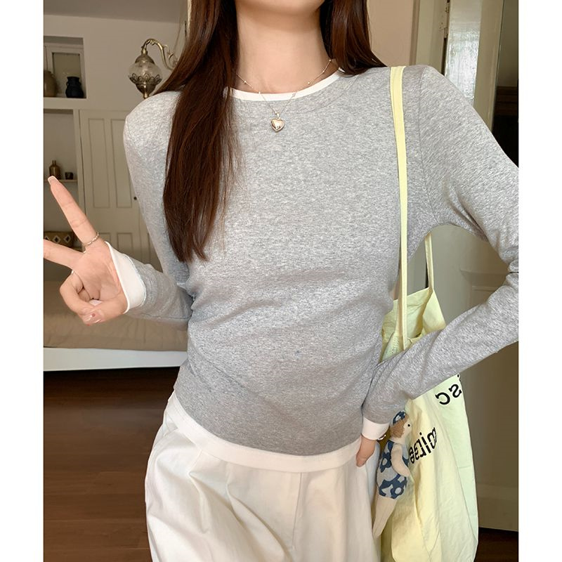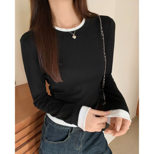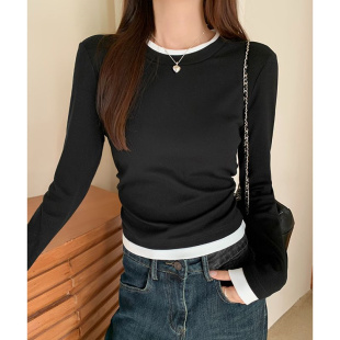 圆领正肩收腰打底衫 新款 上衣 T恤女2025春秋季 潮牌撞色假两件长袖
