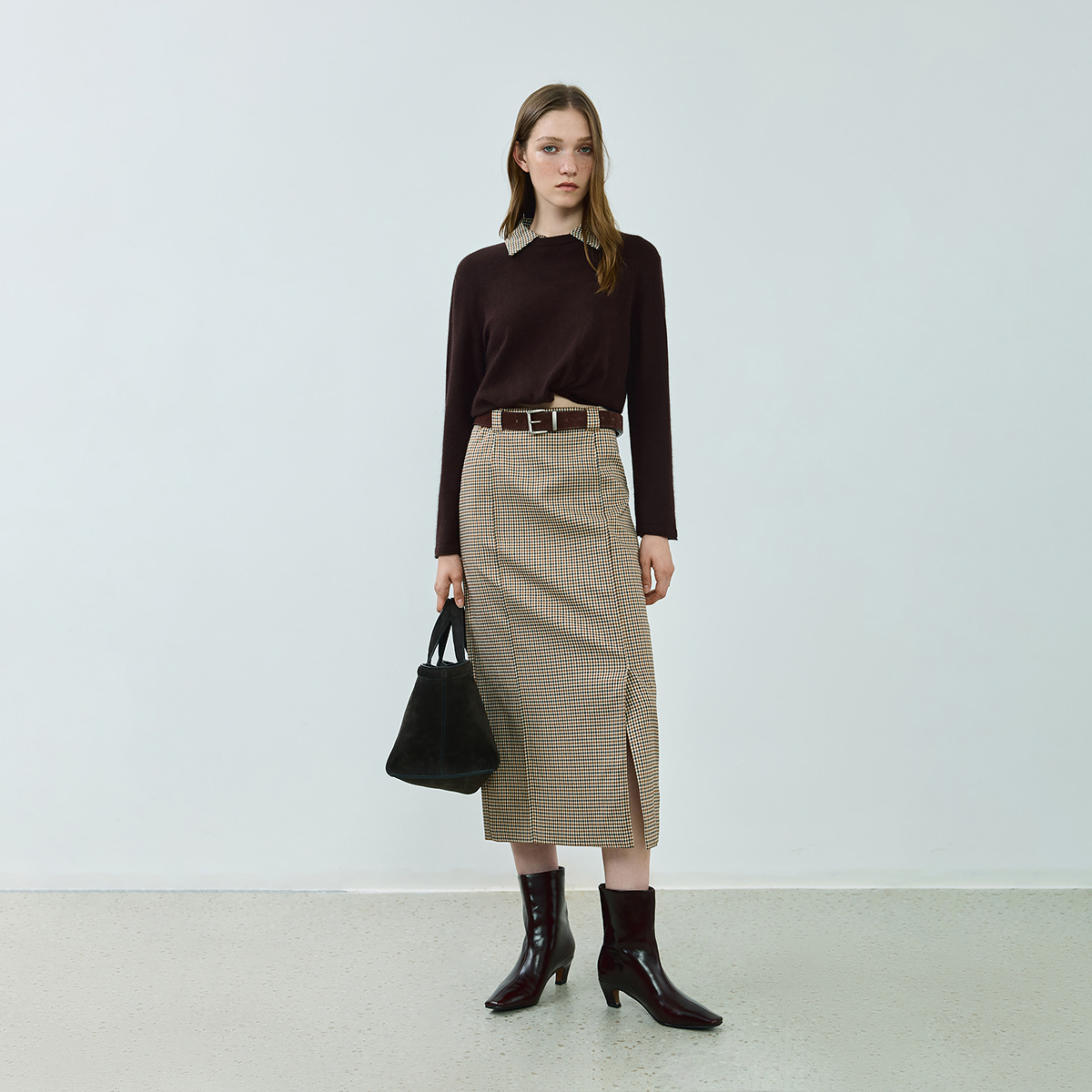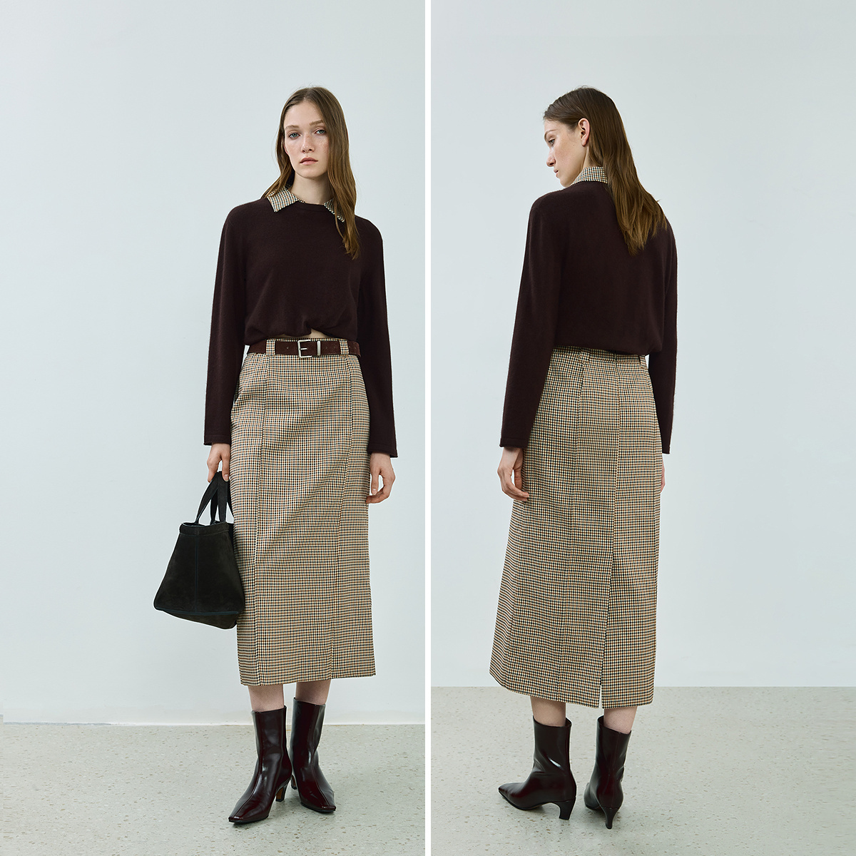 半身裙女 复古格纹印花纱网不对称下摆A字中长款 ONLY2025秋季 新款