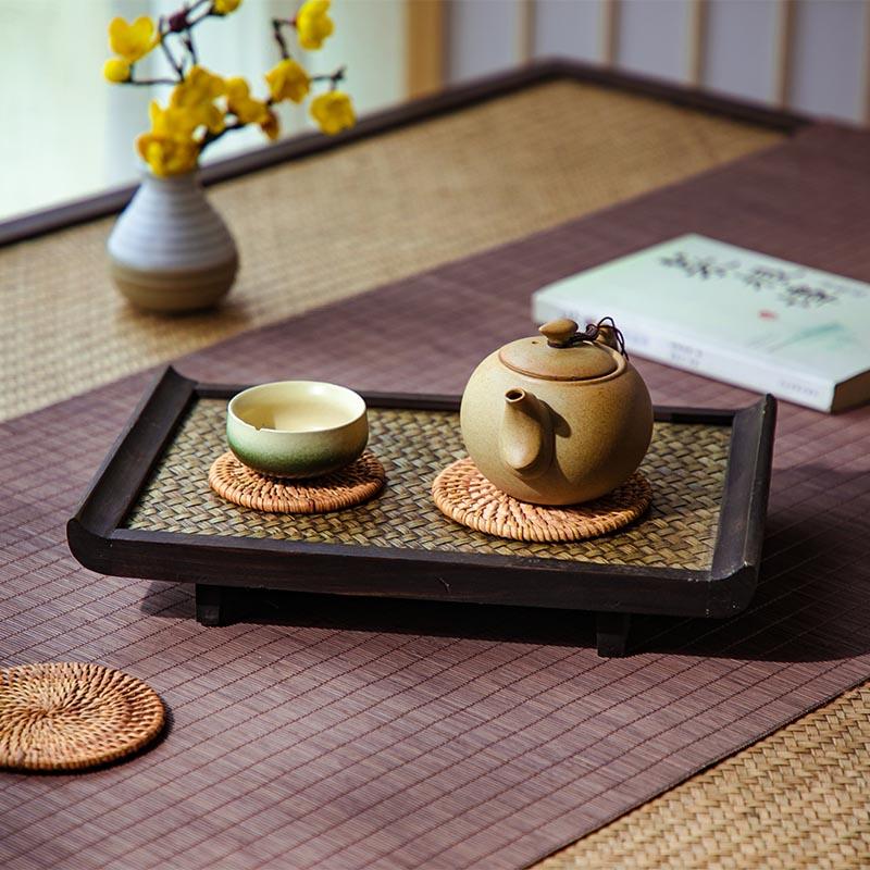 实木竹编藤编户外茶托盘 干泡台茶盘家用日式 泰式 复古茶具托盘中式