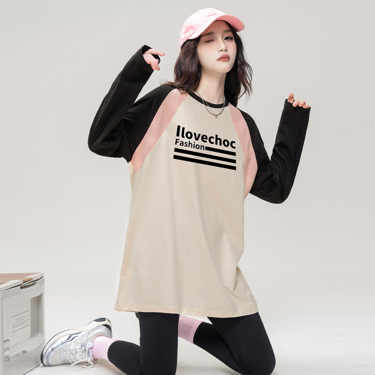 百搭圆领休闲上衣宽松 拼色印花T恤2025秋长袖 ILOVECHOC美式 插肩袖