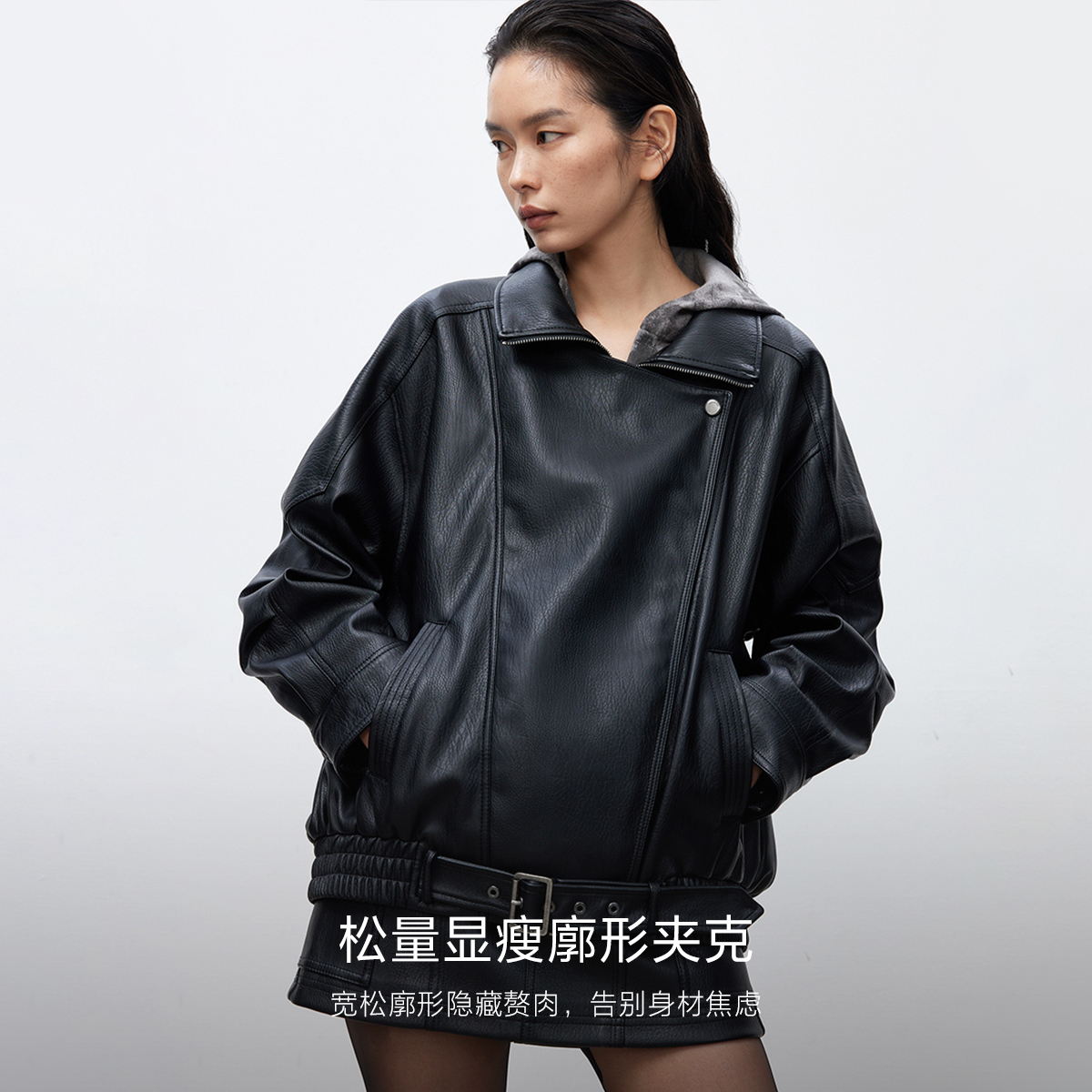 ONLY2025秋季 弹力松紧下摆防风挺括立领纯色宽松PU夹克外套女 新款