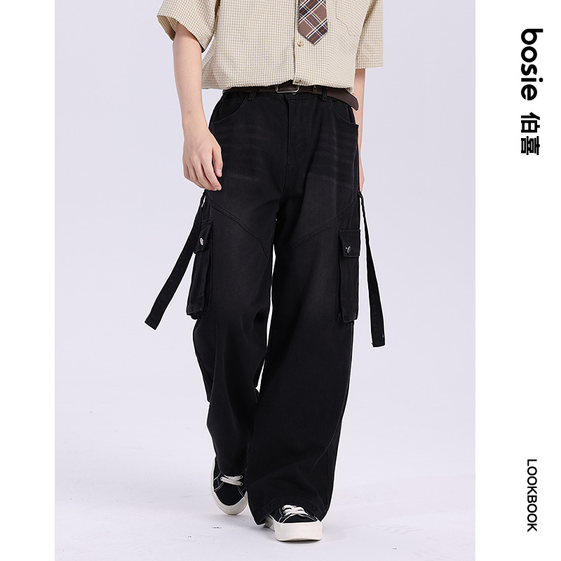 子男秋 直筒深蓝宽松休闲阔腿老爹长裤 马登工装 复古水洗丹宁牛仔裤
