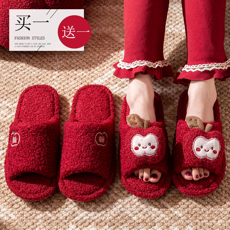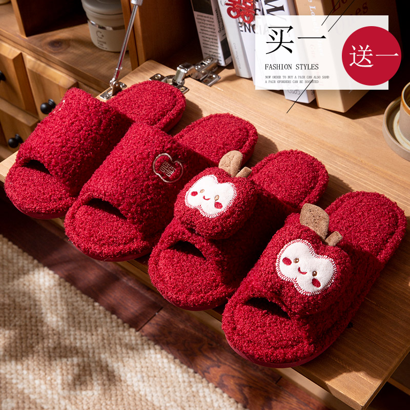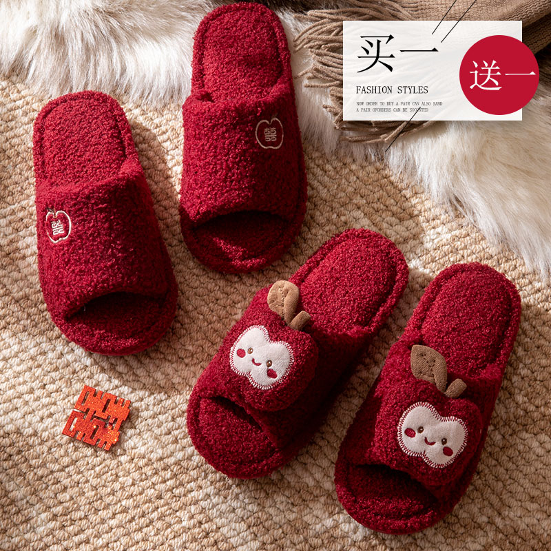 棉拖鞋 喜庆新婚礼新娘喜事陪嫁晨袍情侣婚鞋 结婚一对冬季 红色拖鞋