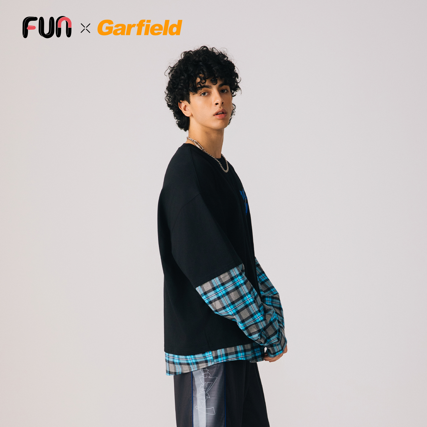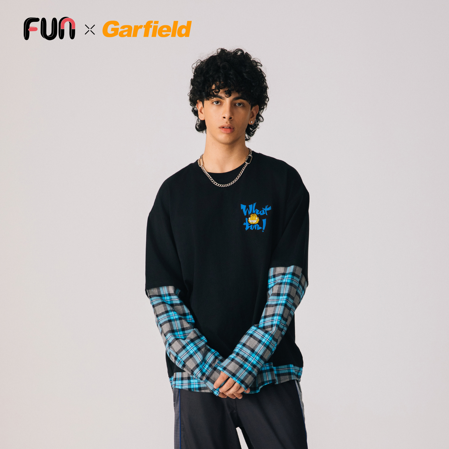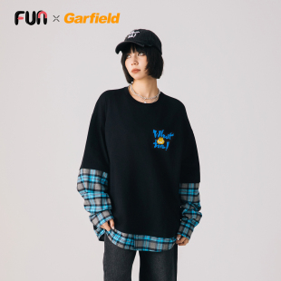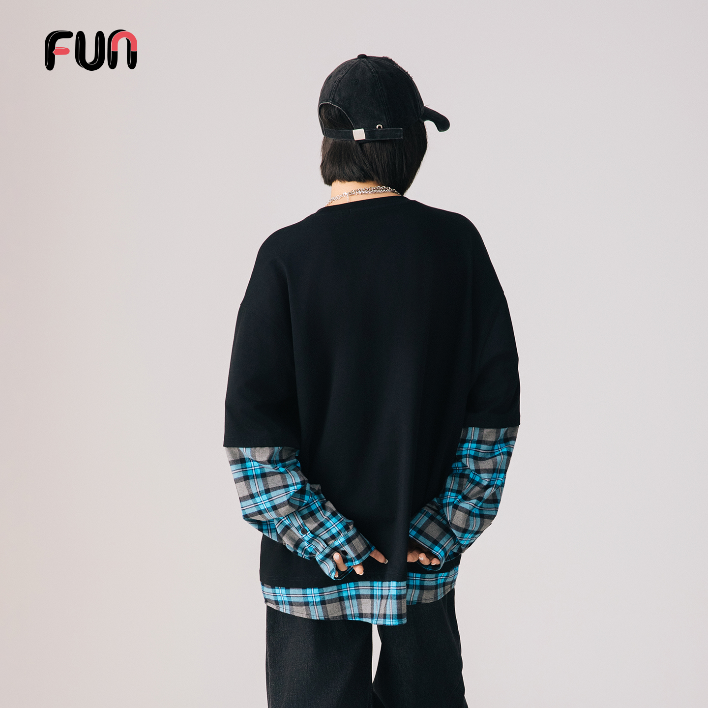 商场同款 长袖 格纹长袖 设计款 T恤 上衣假两件拼接个性 Fun2025秋季