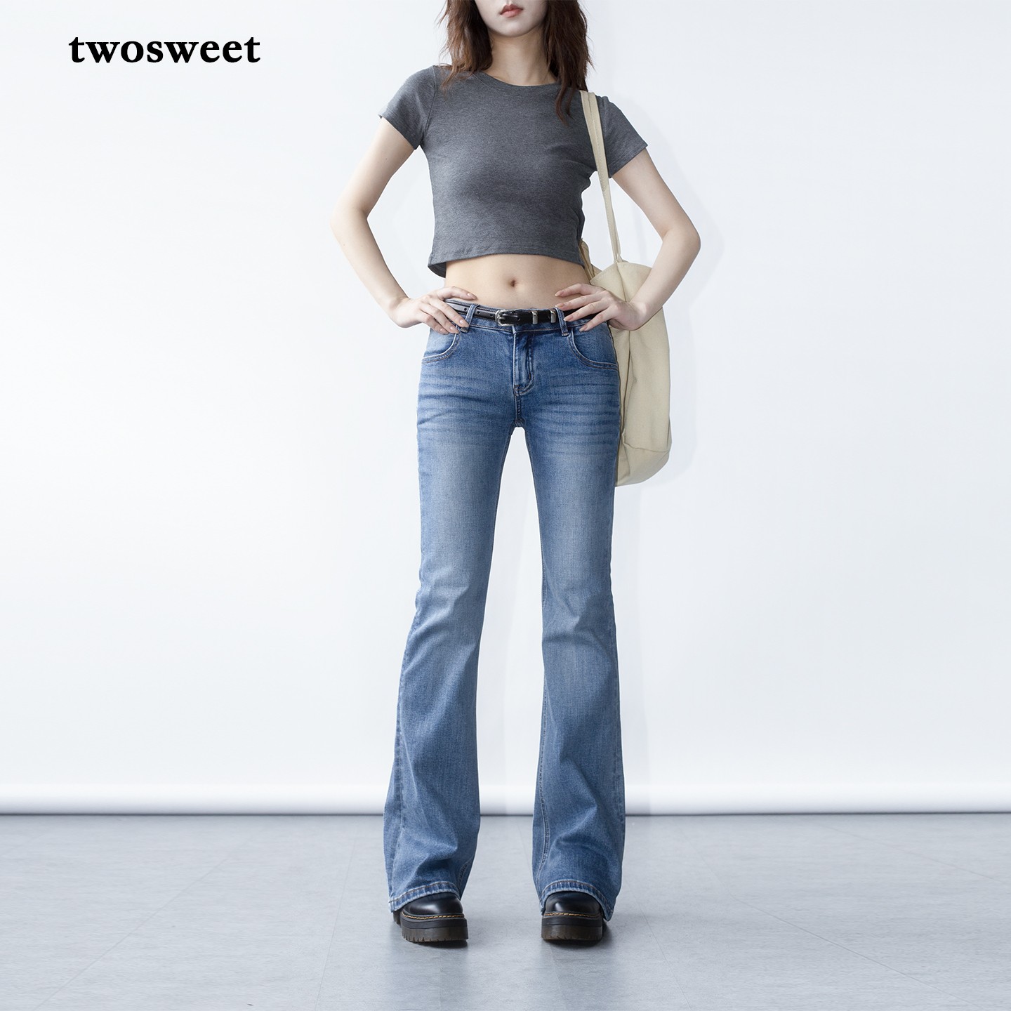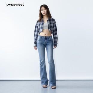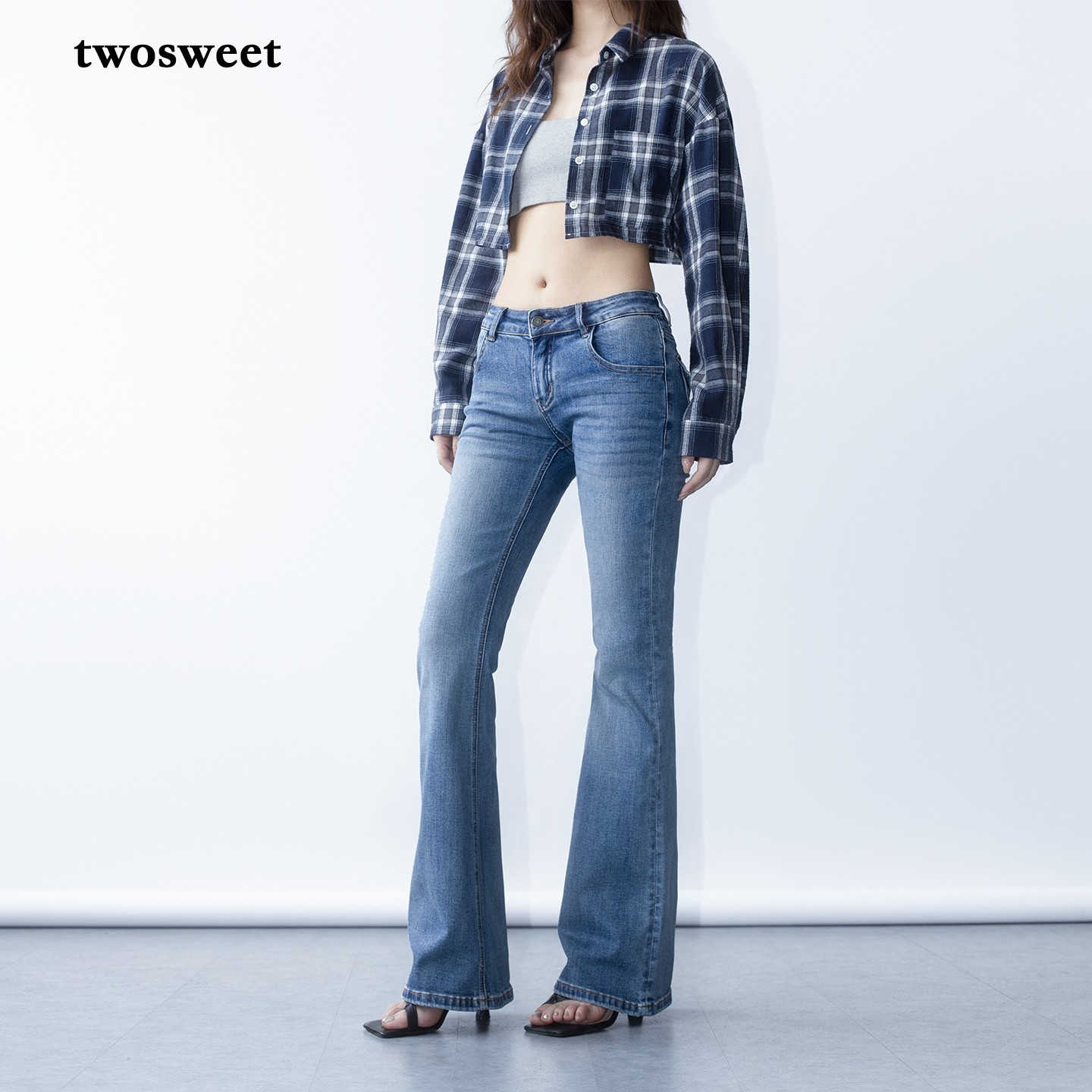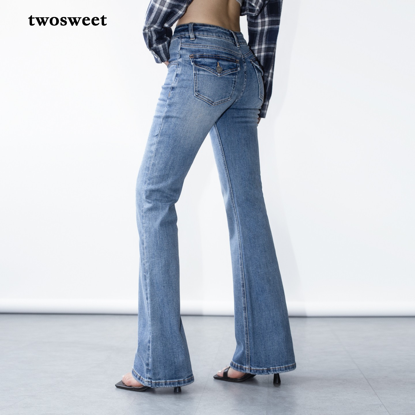 微喇叭弹力牛仔裤 低腰系列复古后袋翻盖修身 蚀美腰臀比 twosweet