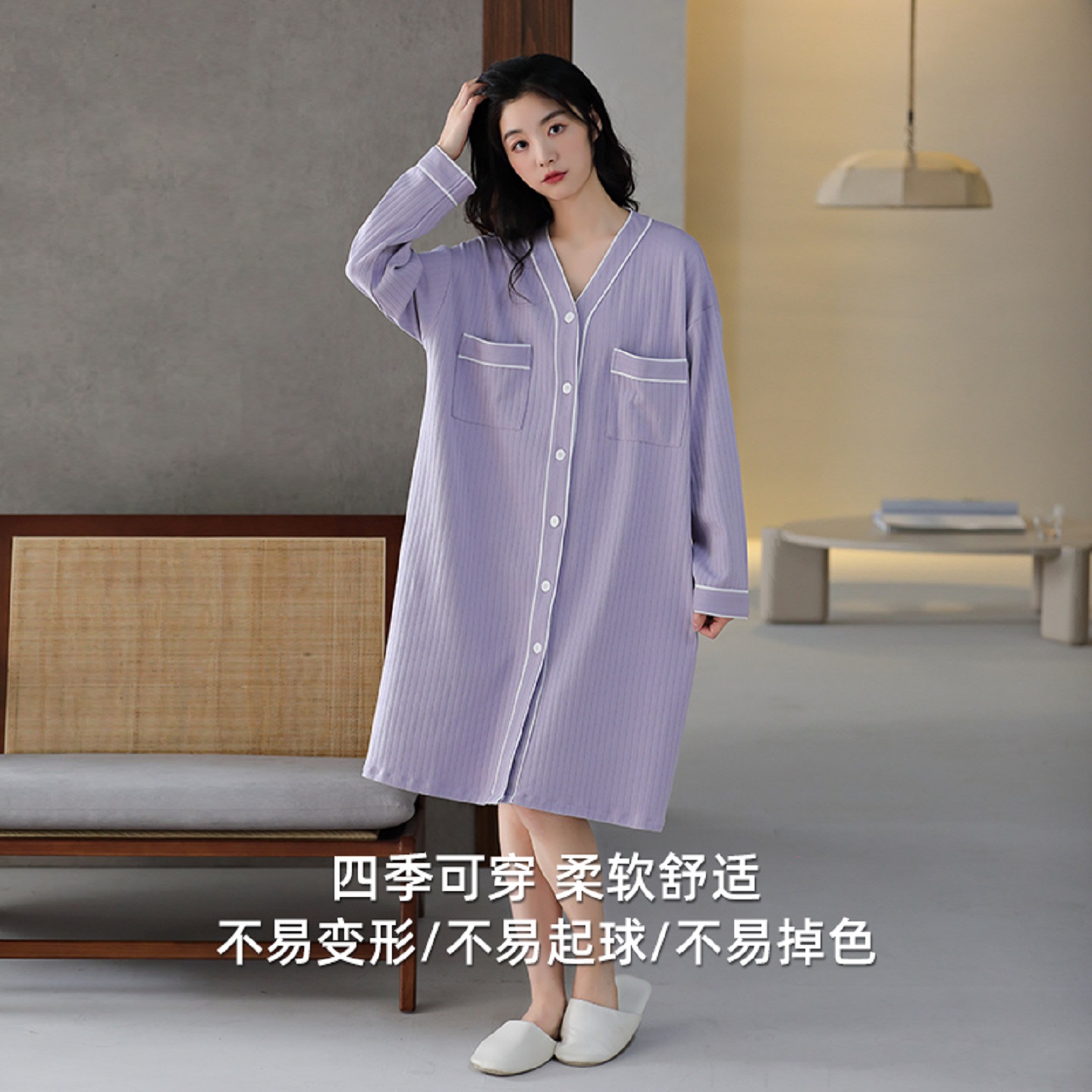 纯棉薄款 长袖 条纹开衫 衬衫 睡裙 南极人睡裙女士睡衣春秋款 大码 秋季