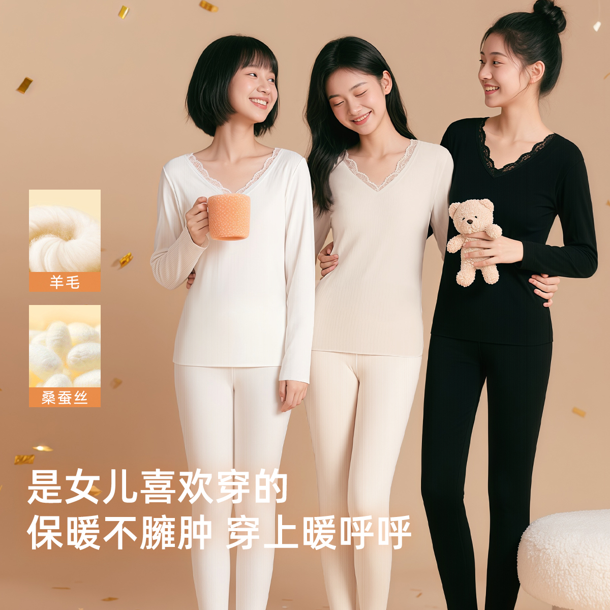 上衣磨毛 加绒加厚羊毛蚕丝秋衣秋裤 德绒保暖内衣女士套装 秋冬季