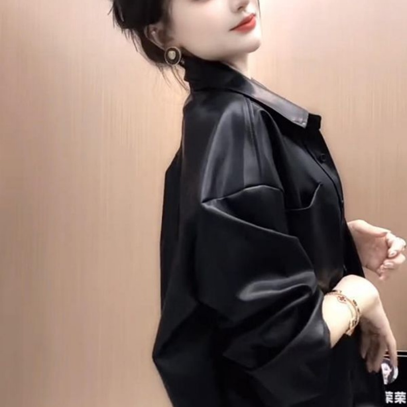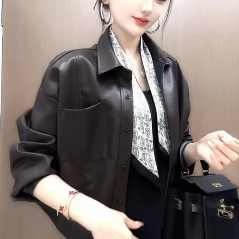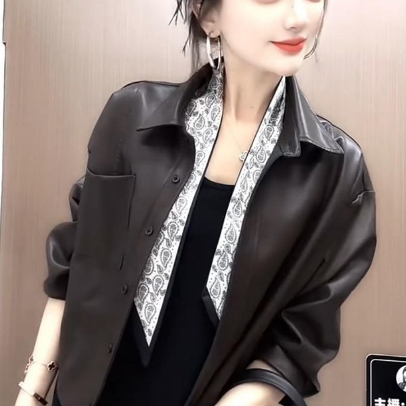 洋气纯色百搭气质翻领PU短款 送丝巾 时尚 新款 夹克外套女 2025秋季