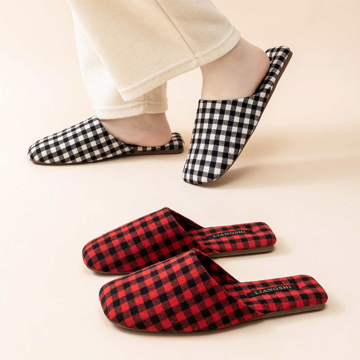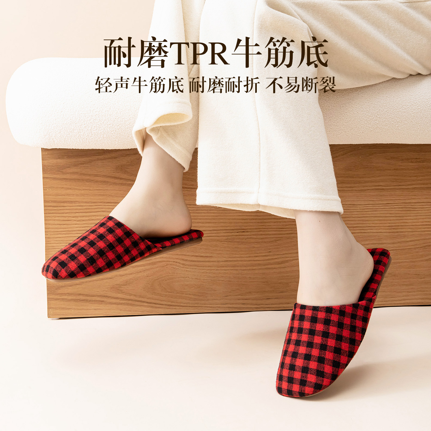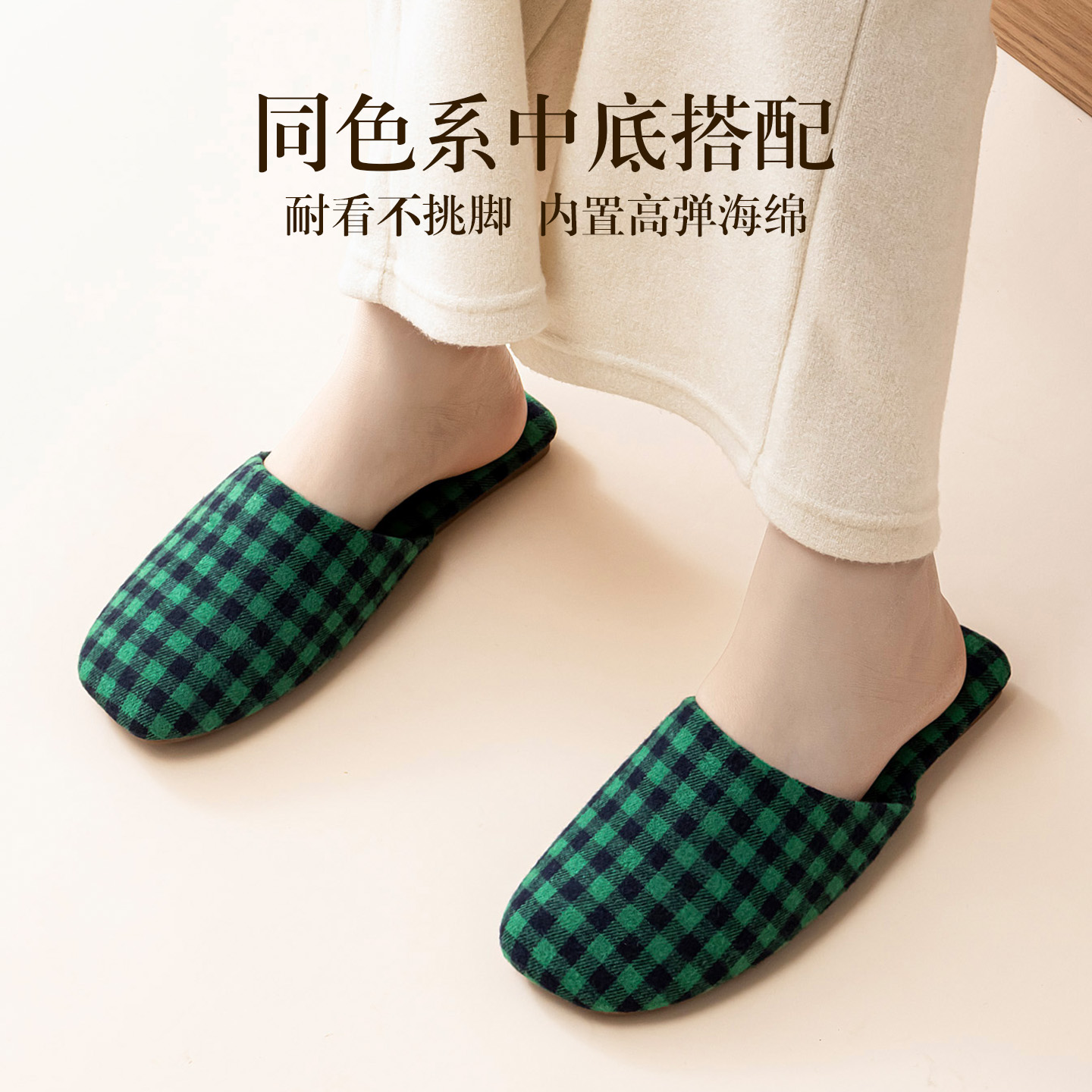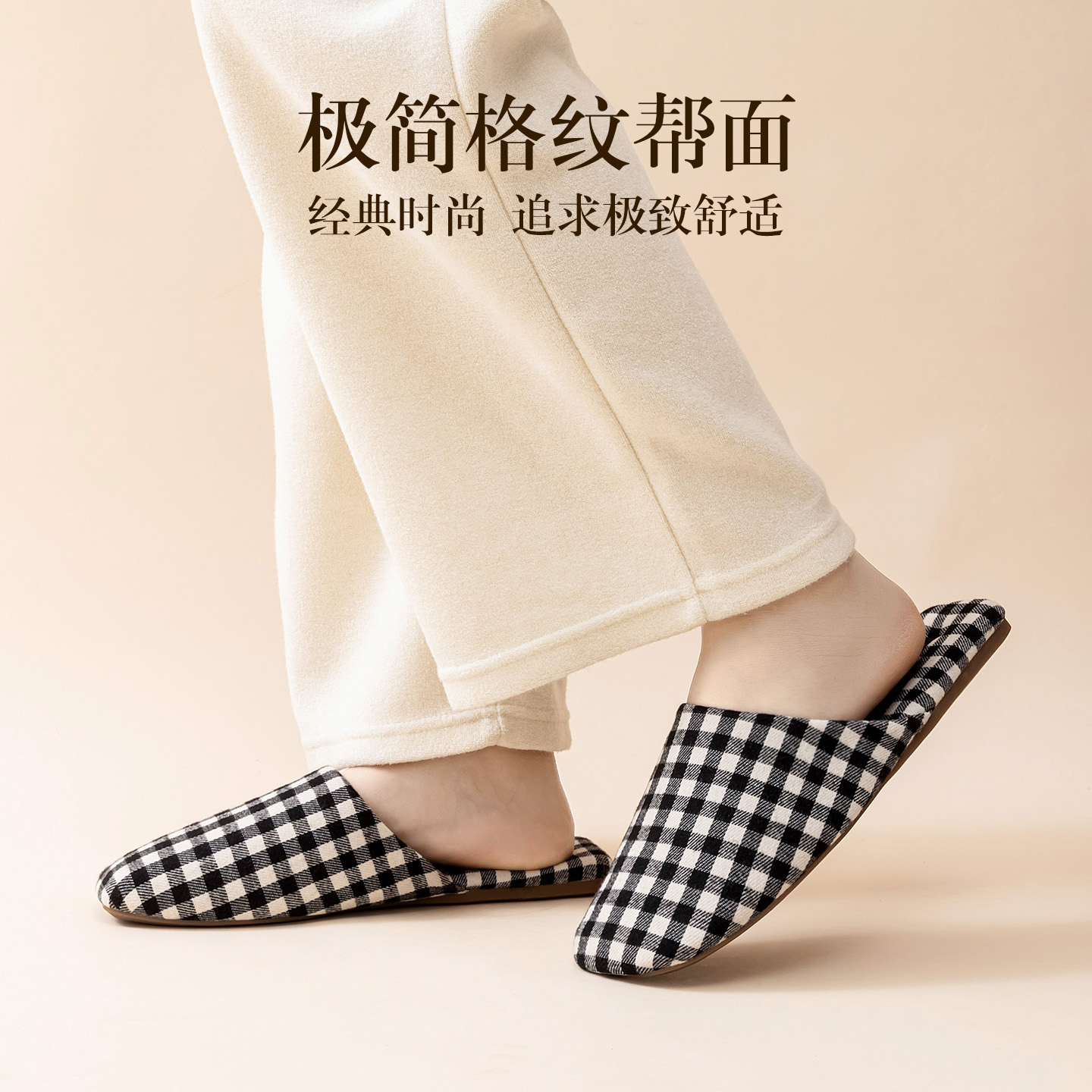 日系格纹春秋棉拖鞋 女情侣透气亲肤牛筋底高级感居家地板家用拖鞋