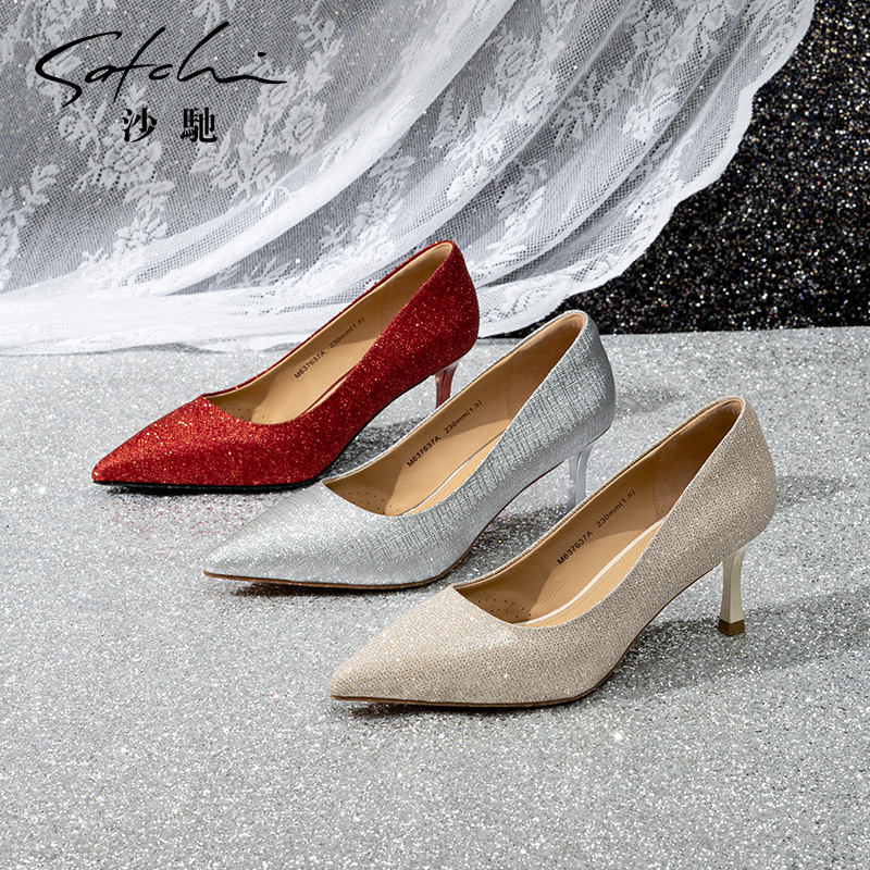 名媛风尖头细跟高跟单鞋 新娘婚鞋 闪钻婚宴鞋 新款 2025秋季 沙驰女鞋