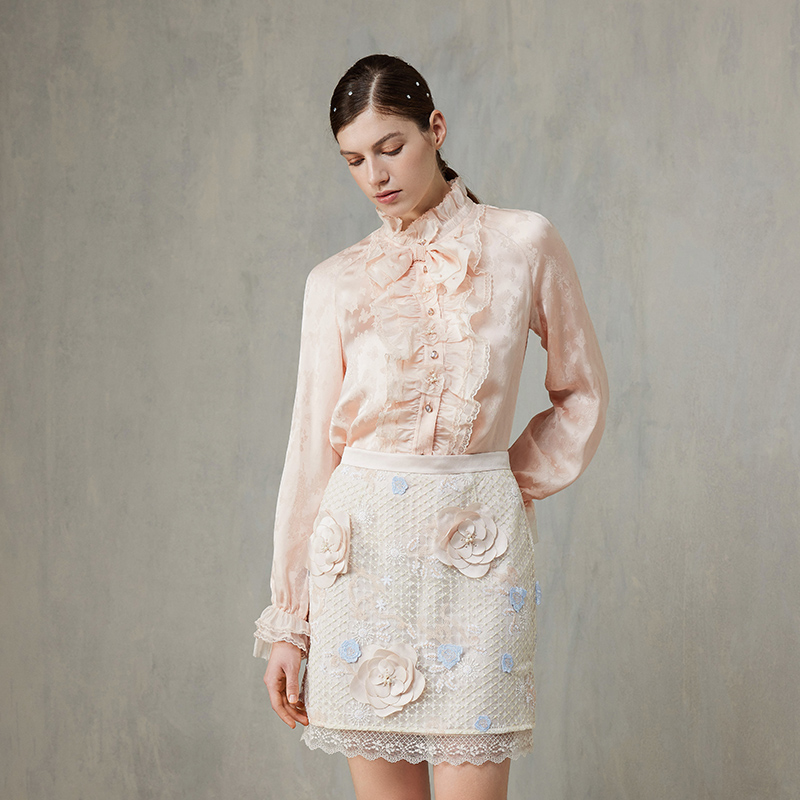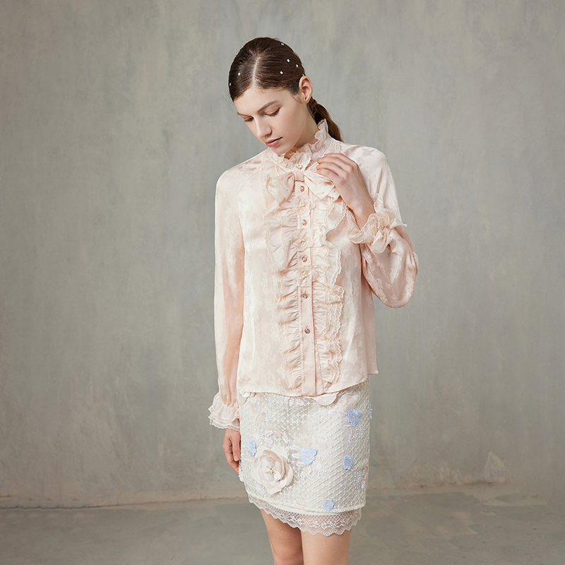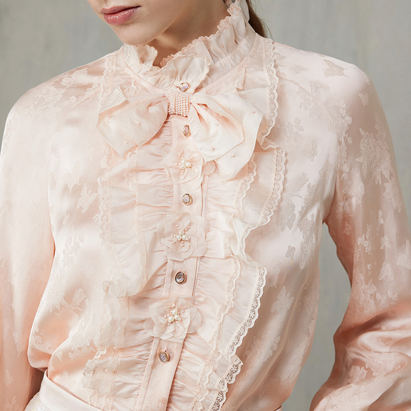 新款 女秋季 重工镂空刺绣设计感宽松减龄百搭上衣 衬衫 杏色灯笼长袖