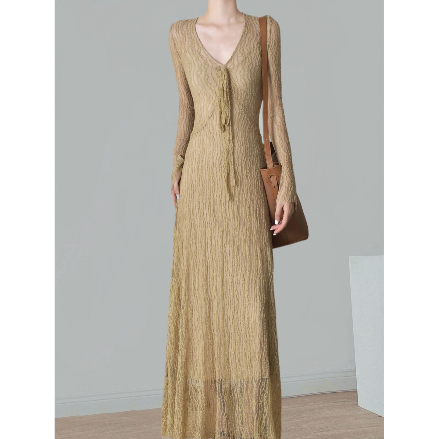 纯欲风修身 新款 显瘦气质长裙 温柔风系带蕾丝连衣裙女秋季 绝美法式