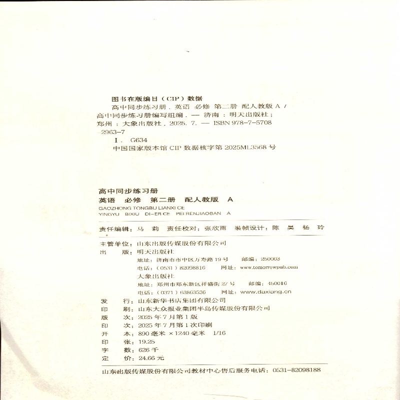 社人教版 2025英语必修2二高中同步练习册A版 大象出版