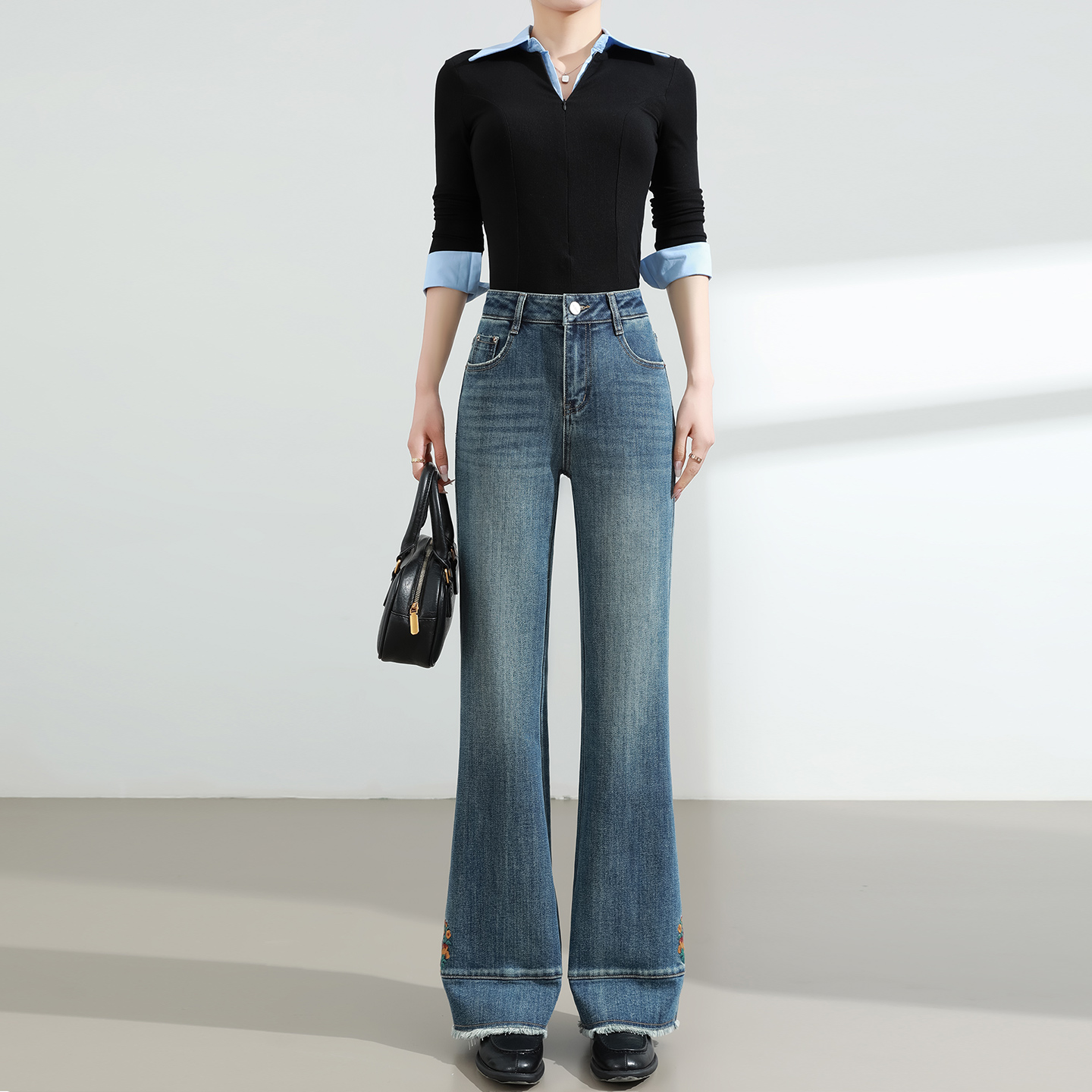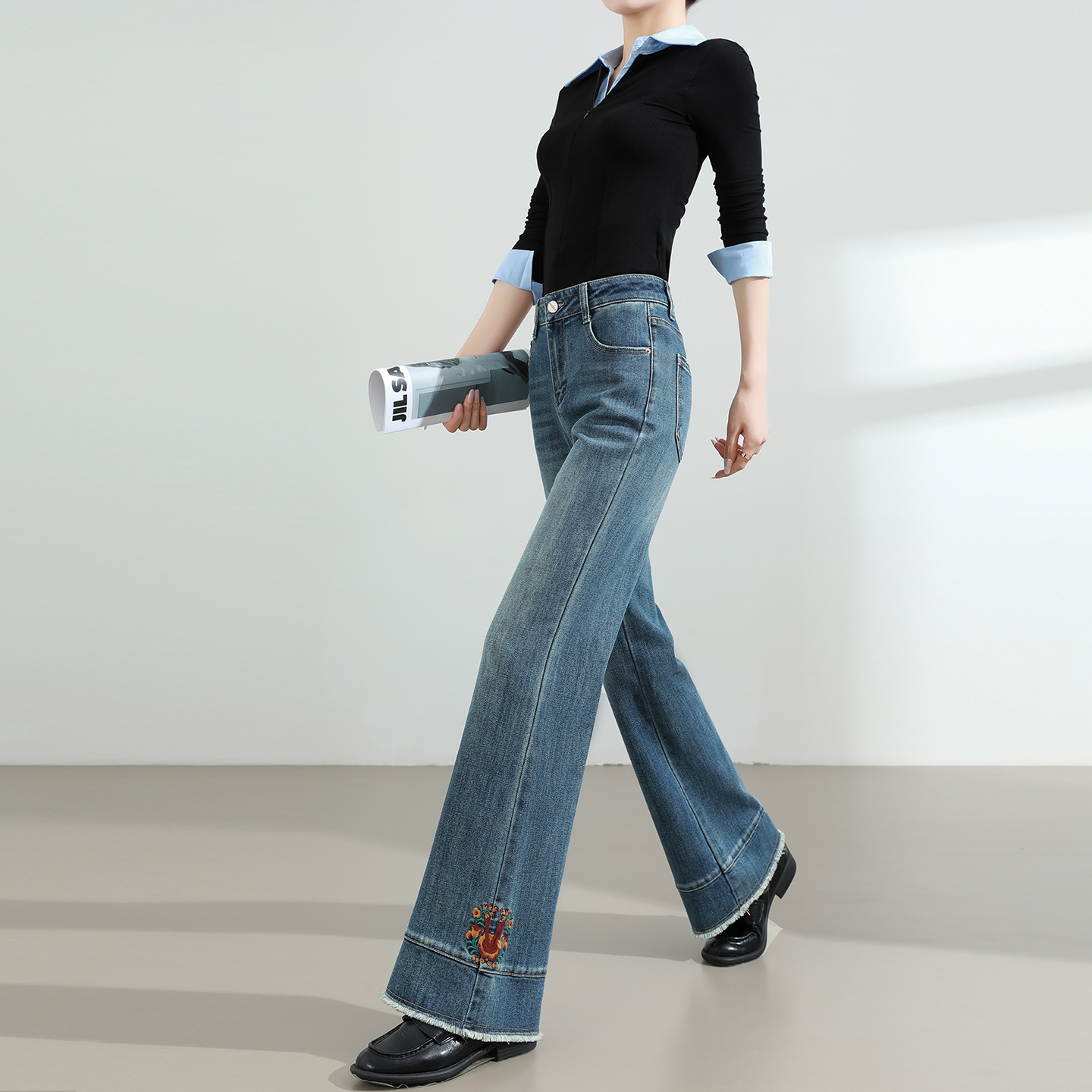 刺绣毛边牛仔微喇裤 马蹄喇叭裤 女2025春秋新款 子高腰修身 裤 新中式