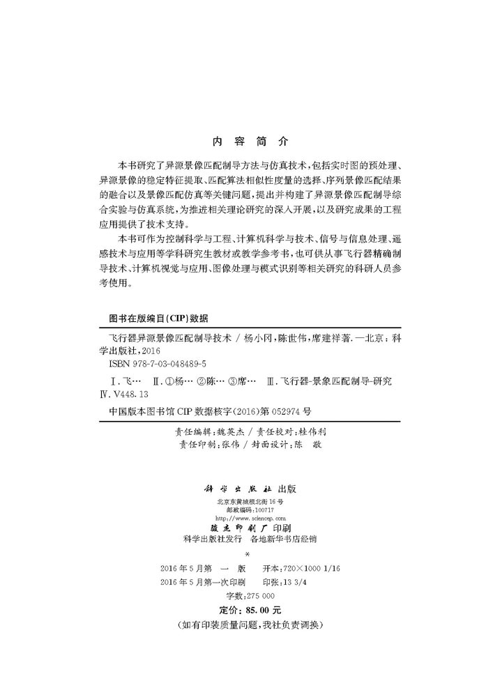 科学出版 正版 杨小冈著 飞行器异源景像匹配制导技术 社 现货