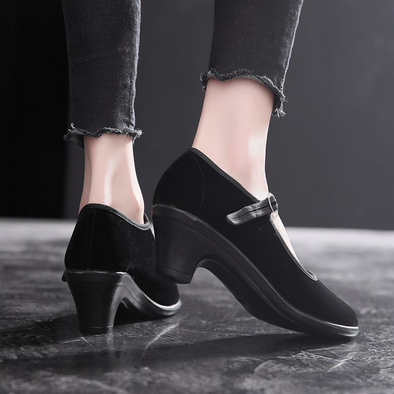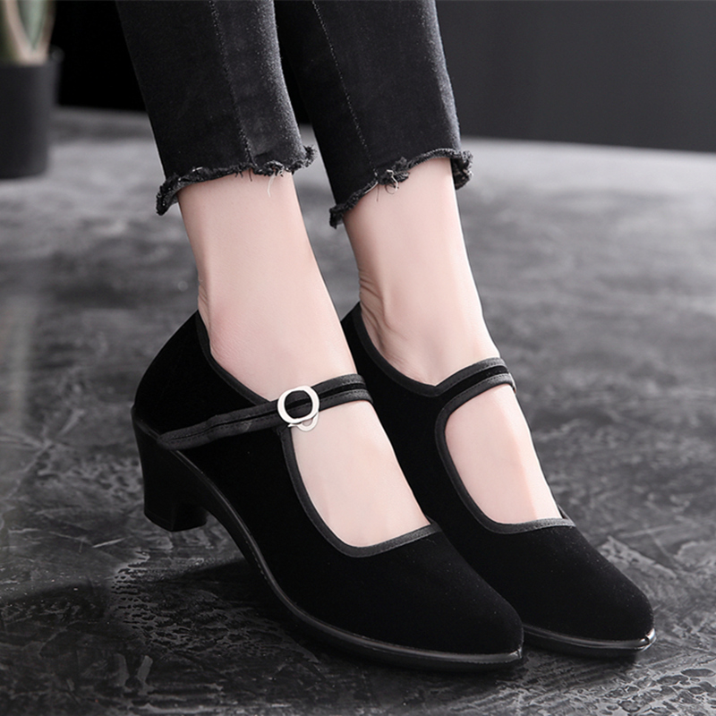 高跟扣带女单鞋 5厘米中跟粗跟浅口酒店鞋 女黑色工作鞋 老北京布鞋