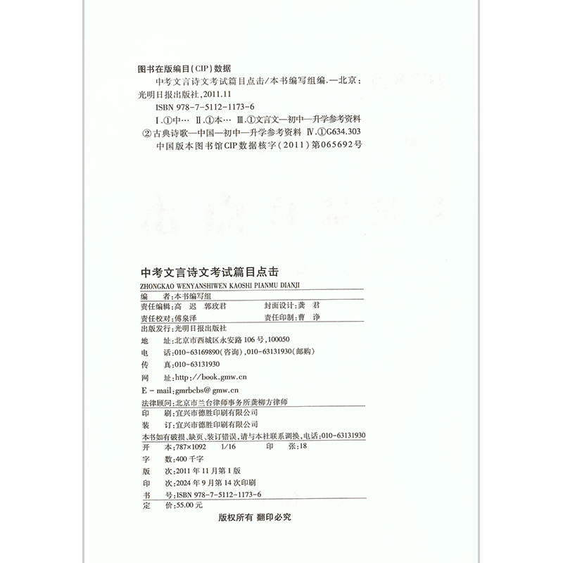 现货2025届新版 光明日报中考文言文点击 中考文言诗文考试篇目点击 不含答案 初中九年级文言文点击 赠阅初三语文模拟测试1 钟书阁