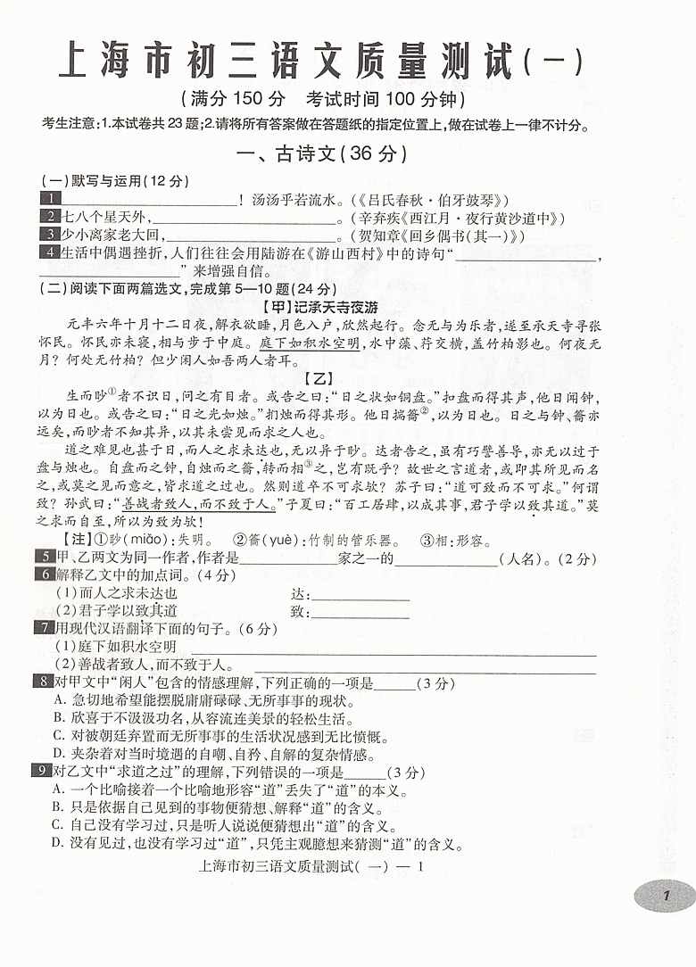光明 上海各区一次模拟卷 语文 上海市中考一模卷 光明中考语文 2025届新版 仅试卷 上海市初三语文质量测试