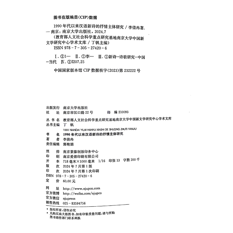 抒情主体研究 社 李倩冉 南京大学出版 9787305274206 编著 1990年代以来汉语新诗