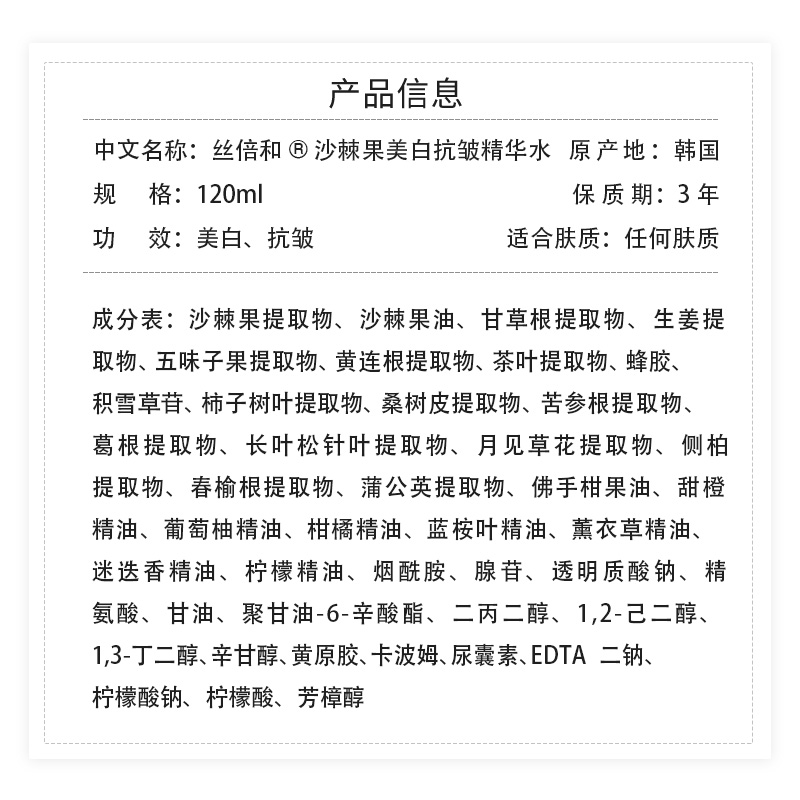 丝倍和沙棘果美白抗皱精华水120ml补水保湿 临期26.8.31 提亮紧致