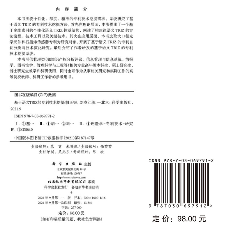 现货基于语义TRIZ 社9787030697912 专利技术挖掘胡正银刘春江著科学出版