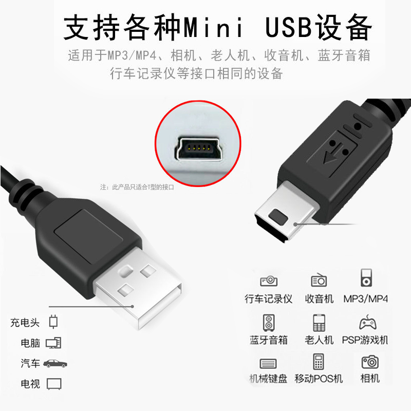 T型口充电线加长供电电源线 MP4老年机硬盘盒相机音响安卓老式 艾胜者 MiniUSB数据线V3适用汽车行车记录仪MP3