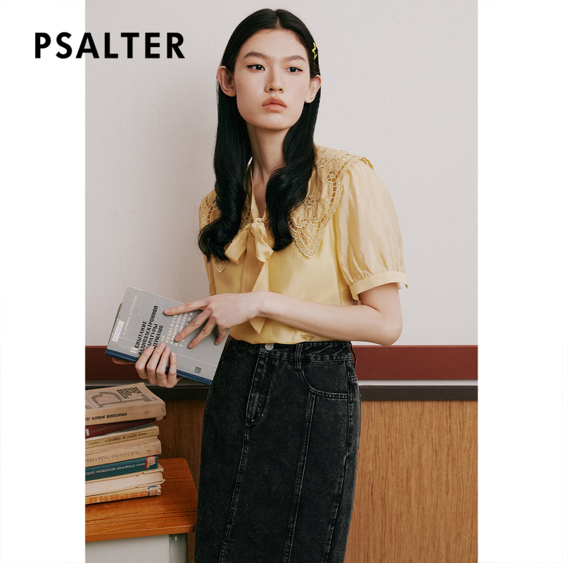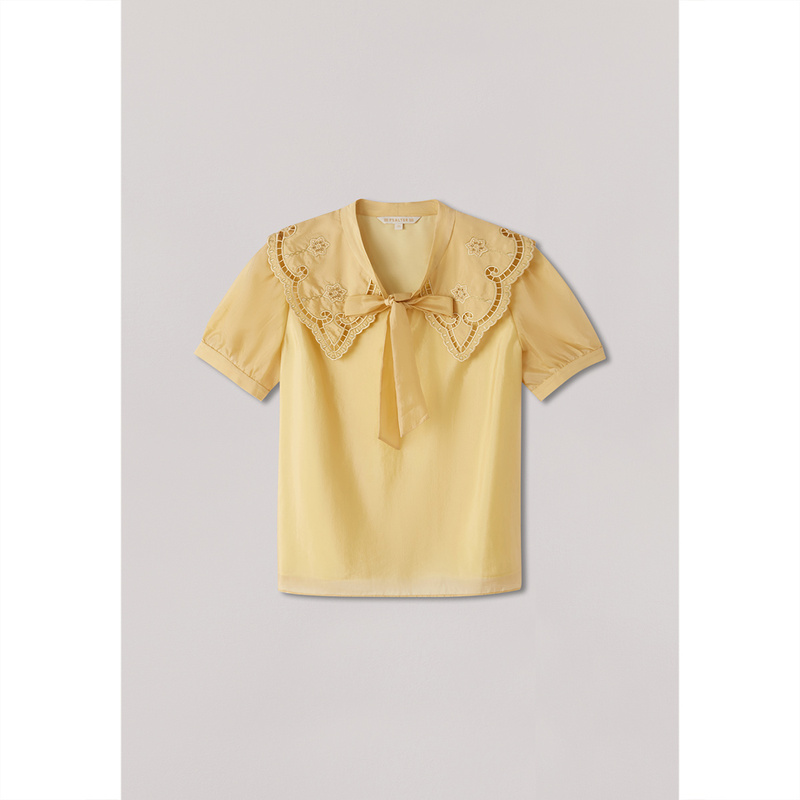 诗篇夏镂空提花飘带领天丝莱赛尔蕾丝雪纺衫
