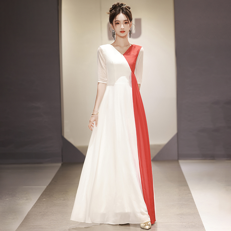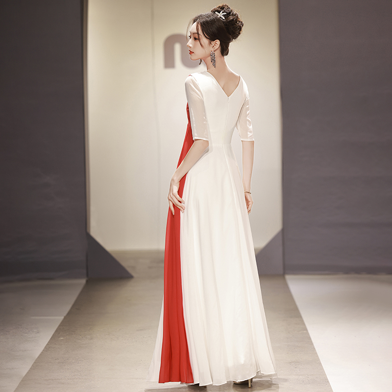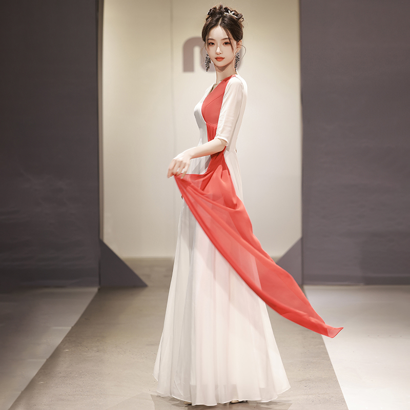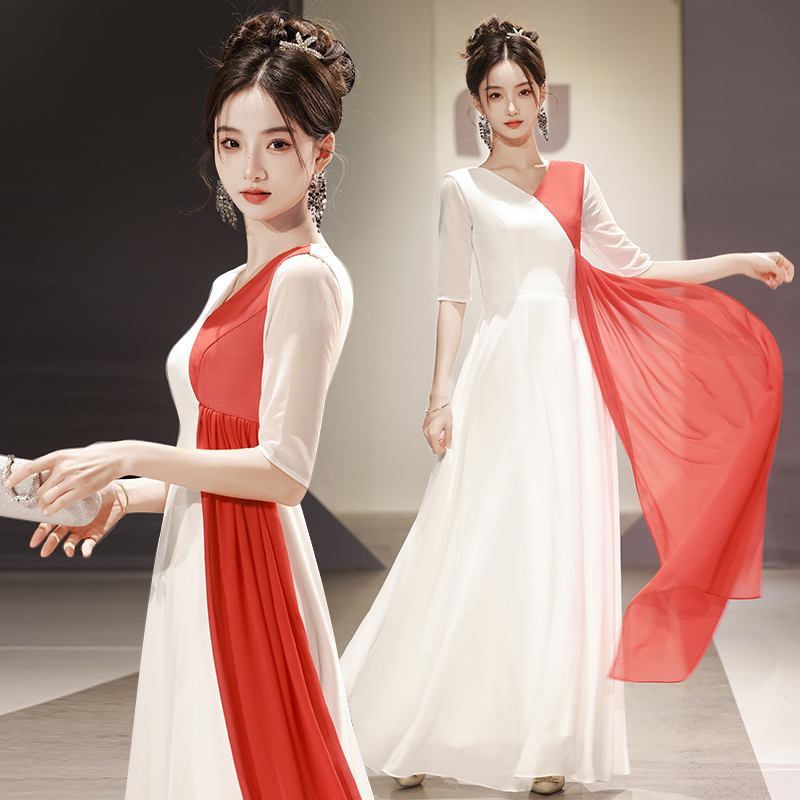 白色V领大合唱团演出服女长裙主持飘逸古筝舞蹈朗诵表演晚礼服装