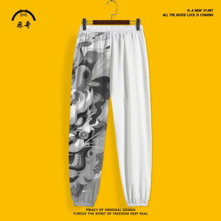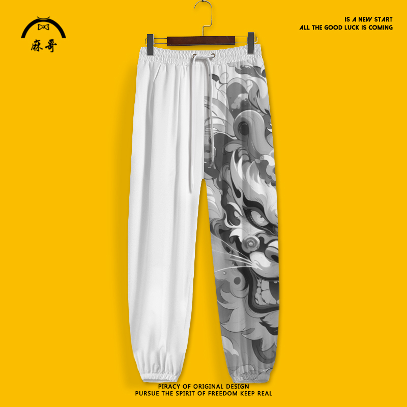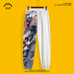 抖抖裤 男士 醒狮印花ins国潮长裤 大码 子 2025新款 加肥哈伦裤 九分裤
