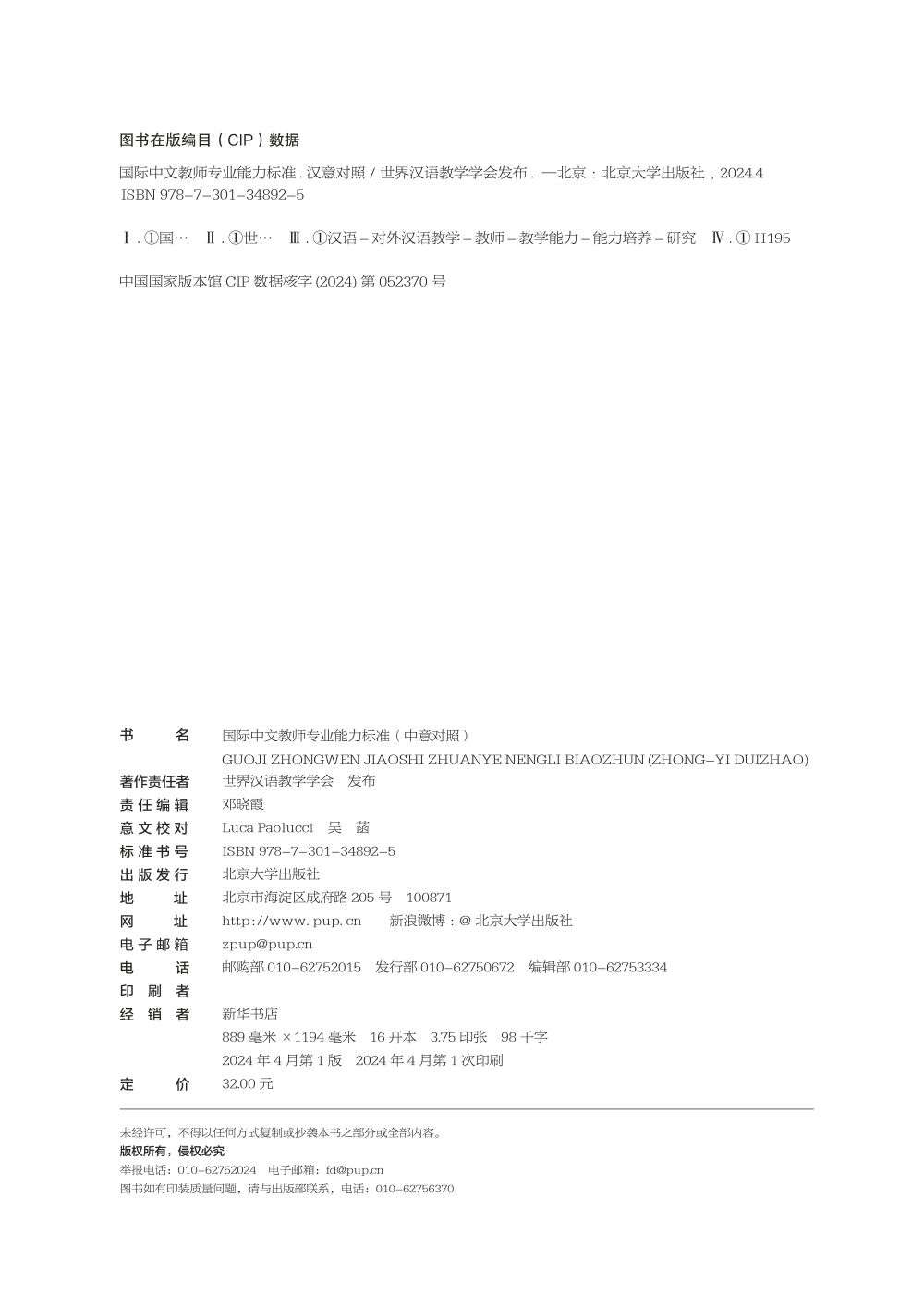 中意对照 社 世界汉语教学学会 北京大学出版 9787301348925 发布 国际中文教师专业能力标准