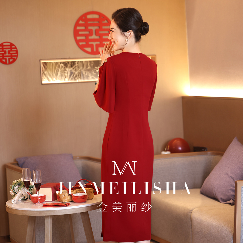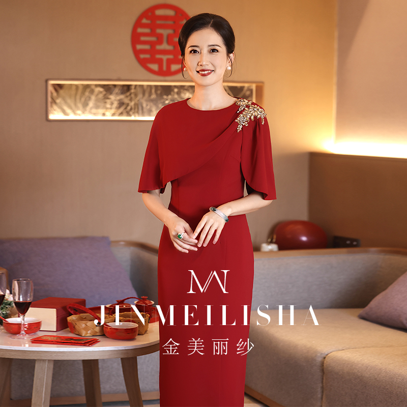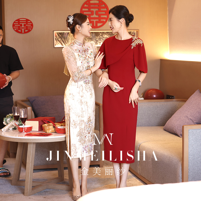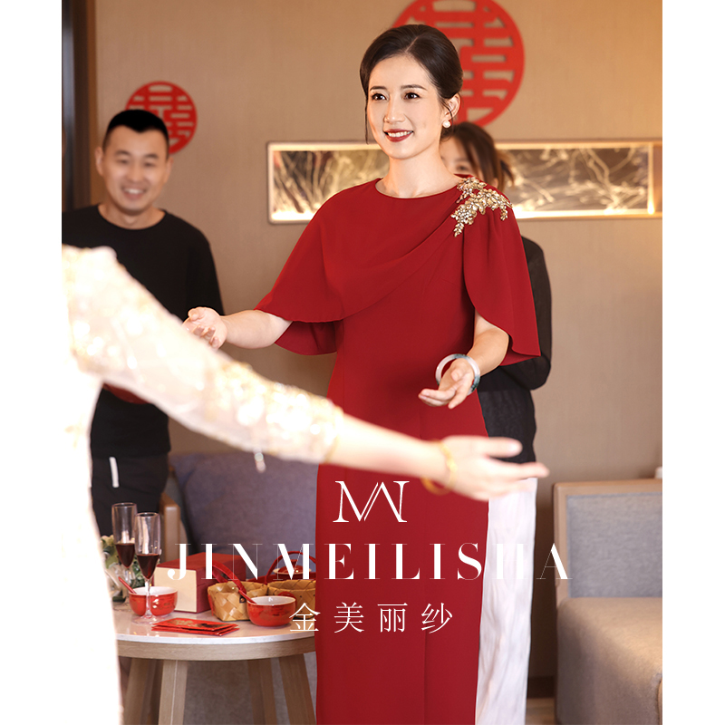 婚宴妈妈礼服2025新款 高级感年轻酒红色参加婚礼喜婆婆连衣裙显瘦