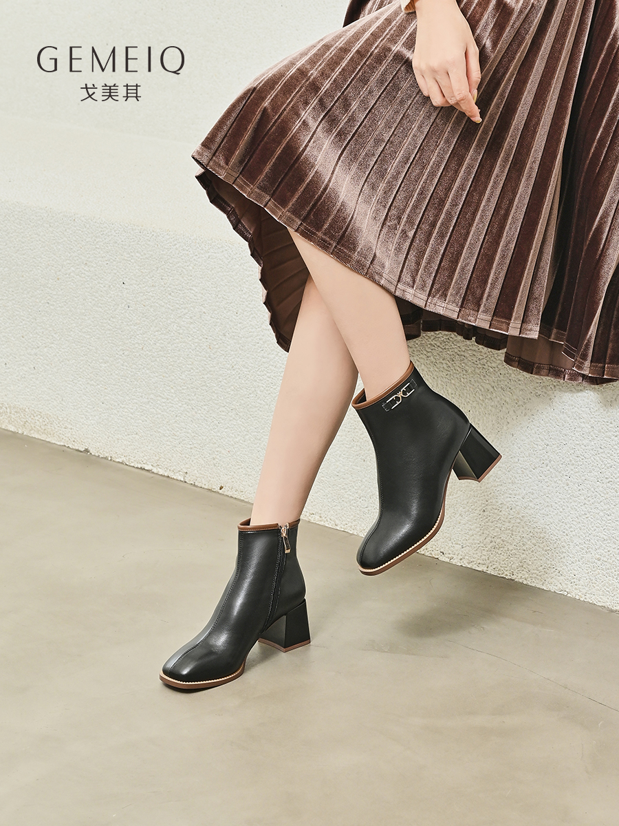 短靴子 英伦风粗跟单鞋 戈美其真皮方头加绒保暖时装 靴女2024新款